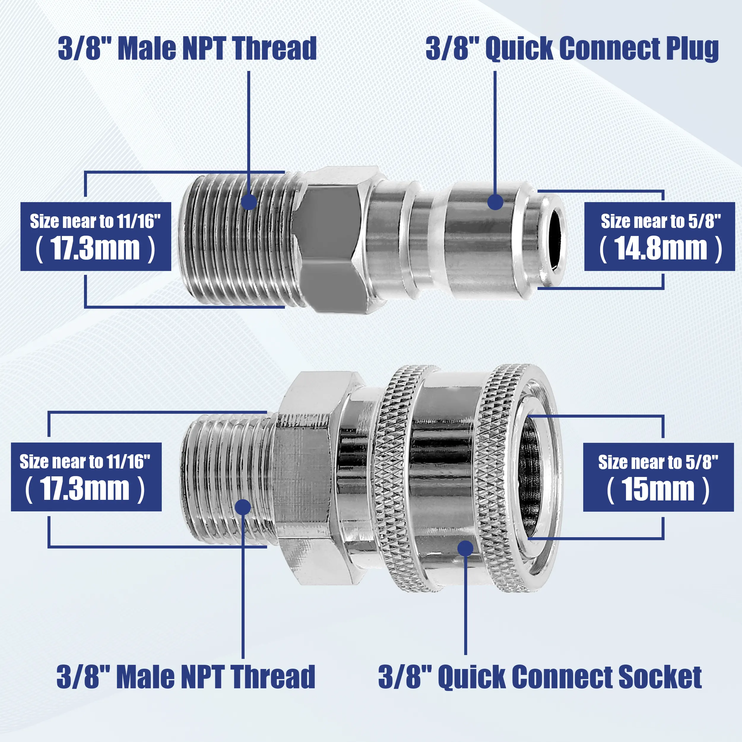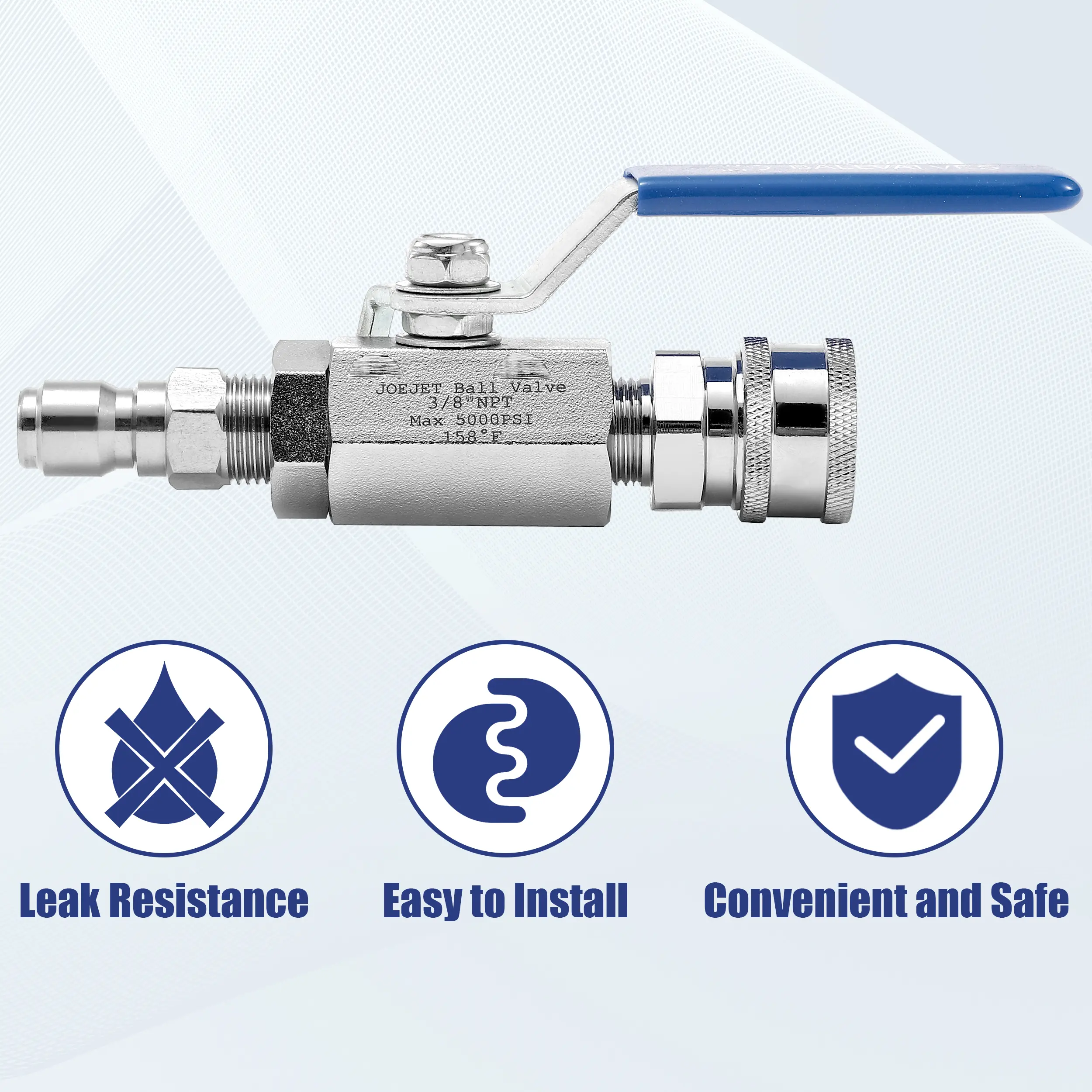 ·【Package Includes】JOEJET high pressure ball valve kit includes a stainless steel ball valve and two adapters: a 3/8” quick connect plug to 3/8” male NPT thread and a 3/8” quick connect socket to 3/8” male NPT thread.