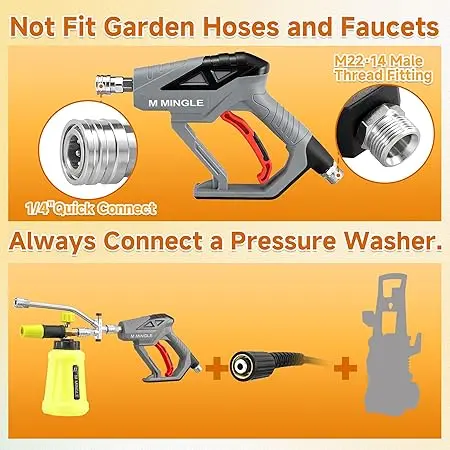 The M MINGLE Pressure Washer features a manual power source with a maximum pressure of 4000 PSI. It includes a 11-inch hose and weighs 3.67 pounds. The ergonomic handle design ensures easy operation. Perfect for cleaning vehicles, roofs, and driveways efficiently.
