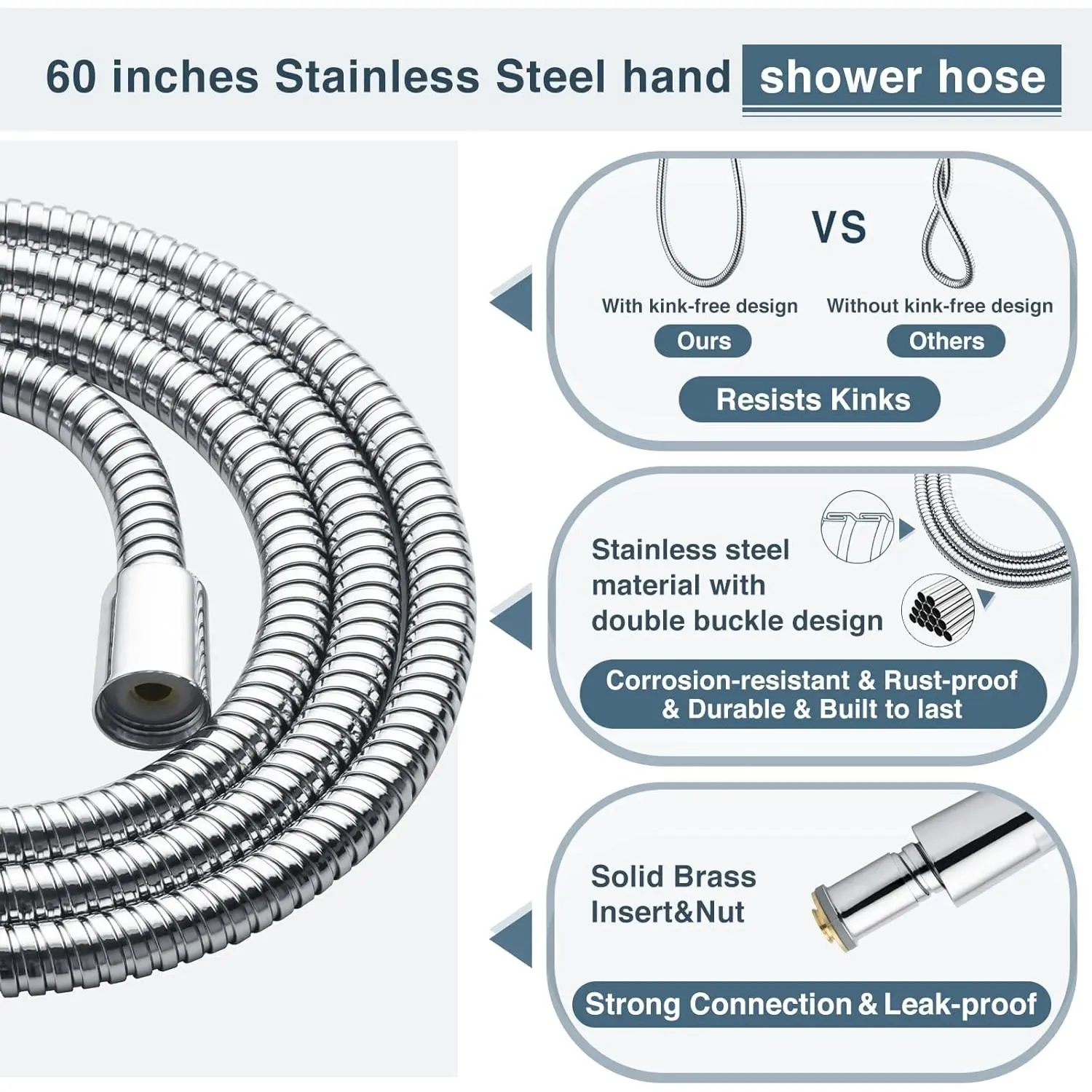 60 Inches Flexible Stainless-Steel Hose - shower hose is super flexible that is convenient for you to hold it in any position to bathe your or let them bathe themselves. Kink-free design helps you rotate the shower freely without worrying about the hose
