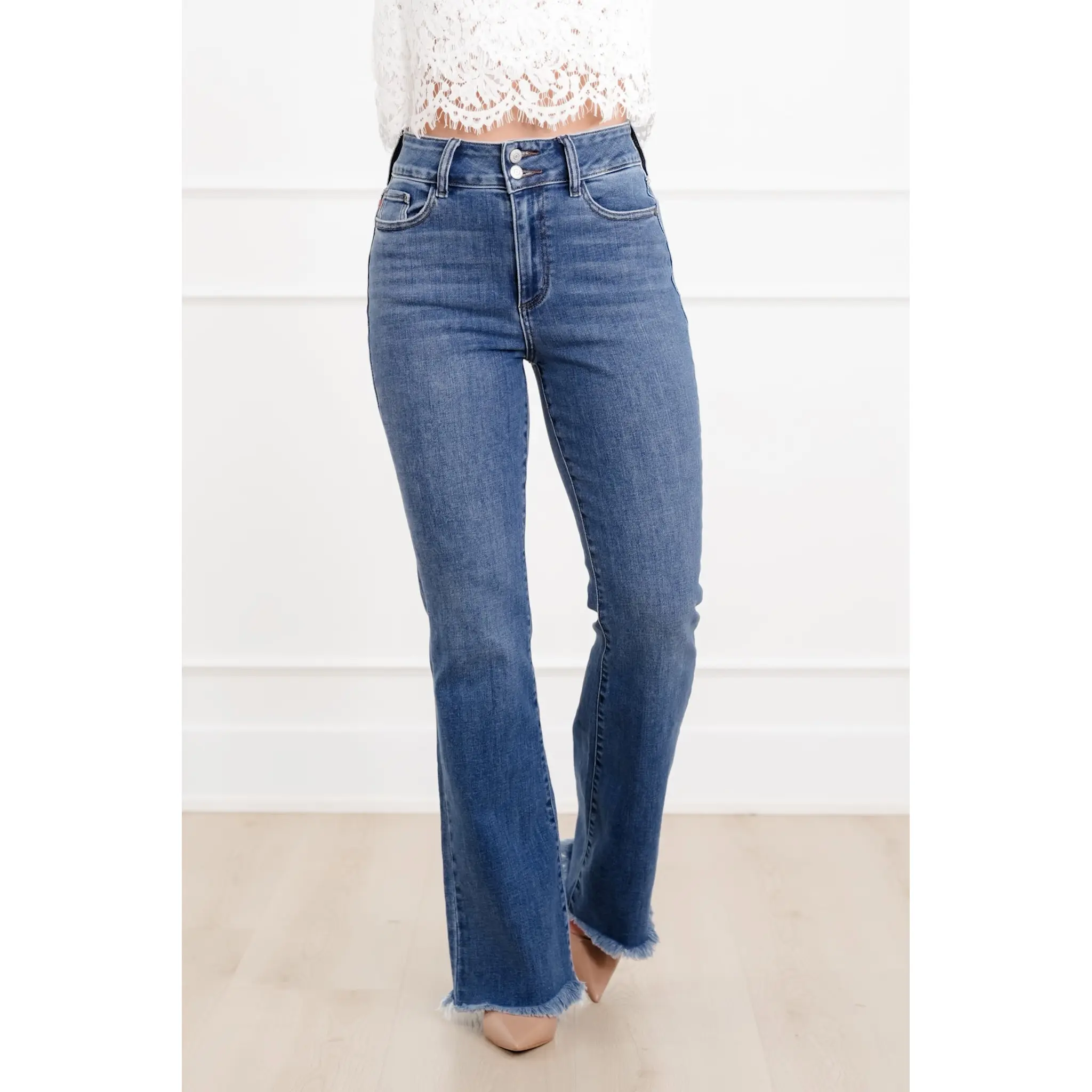 These jeans bring together sculpting comfort and standout style with soft stretch denim, a flattering high rise, and that waist-snatching double button detail everyone loves. The medium wash makes them easy to pair with anything, while the bootcut leg creates a long, balanced look that works with sneakers, boots, or heels. The raw frayed hem adds a fun, modern finish that keeps your outfit feeling fresh.