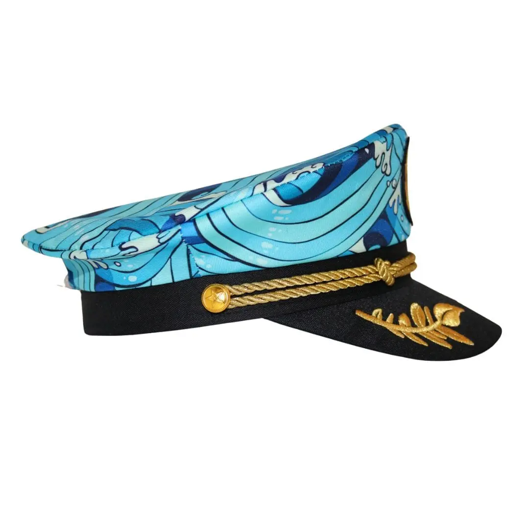 The High Tide Captain Hat features a flowing blue wave pattern designed for boat days, beach hangs, and sunset cruises, finished with the classic captain insignia.