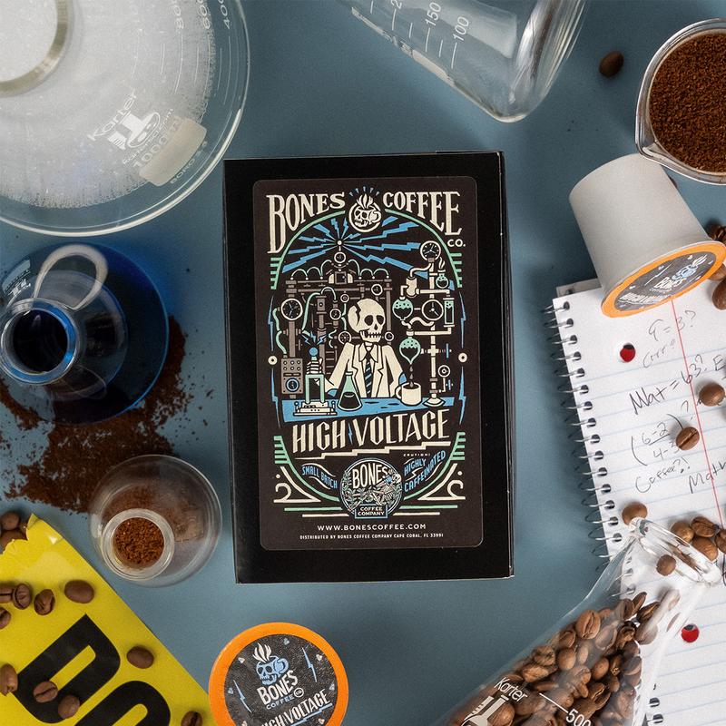 Bones Coffee Company's High Voltage is the strongest, greatest tasting coffee you'll ever drink. This signature blend of hand-roasted beans holds nothing back and delivers a unique experience that only Bones Coffee Company can provide.