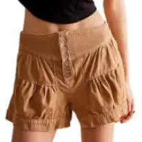 ยทใDESIGNใThe front of the shorts is decorated with a row of brown buttons, adding a retro feel. The shorts have an elastic waistband at the waist, which provides a good fit, while also featuring a pleated design that adds a sense of layering. The leg design is loose and has some wrinkles, which adds some casual and comfortable feeling to the shorts.