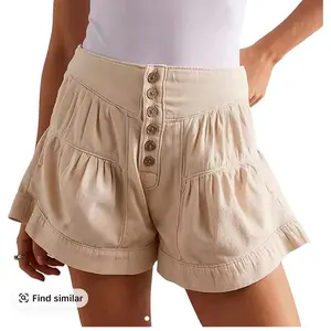 ยทใFEATURESใDenim shorts for women trendy 2025 feature a row of buttons, ruffle elastic hem, pleated, high rise, wide leg, loose fit, solid color, regular length. Fashion and Flowy. This flare shorts for women is a must-have in your summer wardrobe!