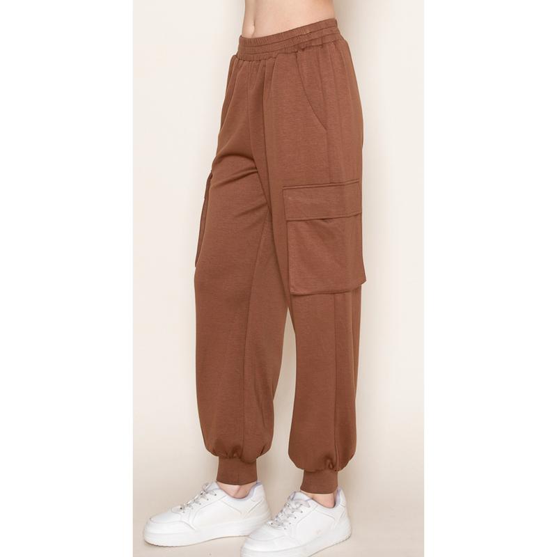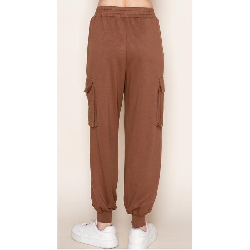 High Waisted Solid Knit Cargo Joggers - Brown - Full