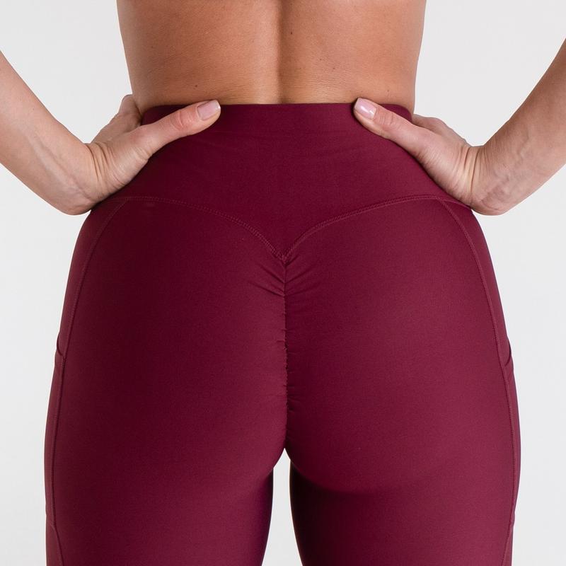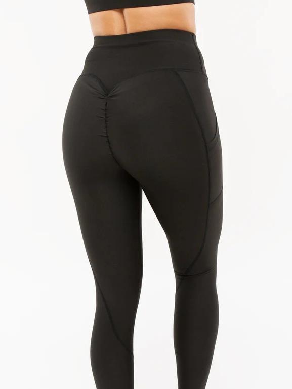 Scrunch bottom leggings utilize a special sewing technique where the fabric gathers just below the tailbone (between the buttocks) to accentuate the shape of the buttocks. The material is pinched in a way that enhances the appearance of the buttocks, creating a flattering look.