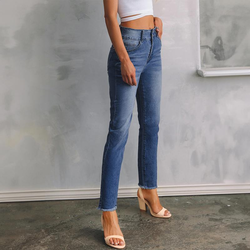 Features: Straight leg jeans with a high waist, two button fly on front and raw hem design, showcasing elegant curve beauty, displaying a distinctive sense of style