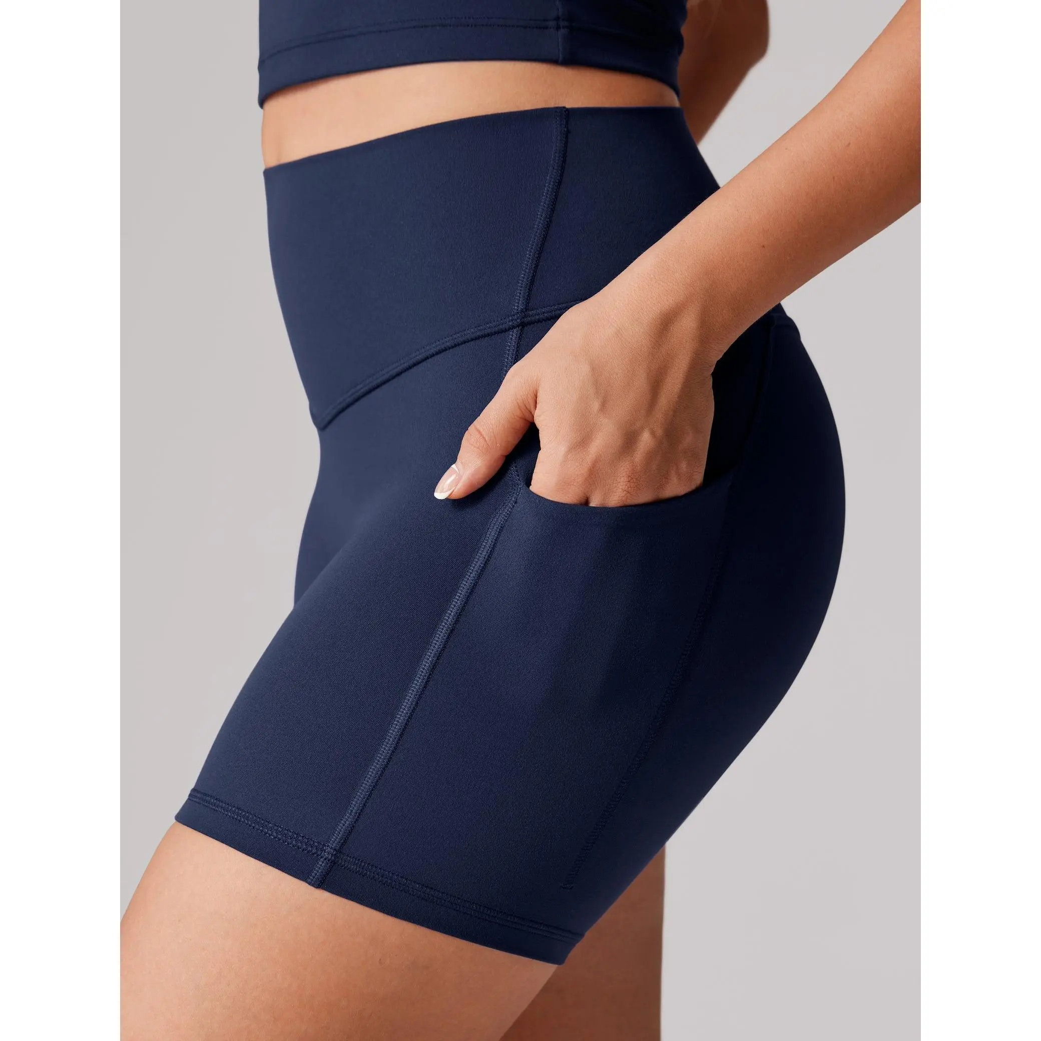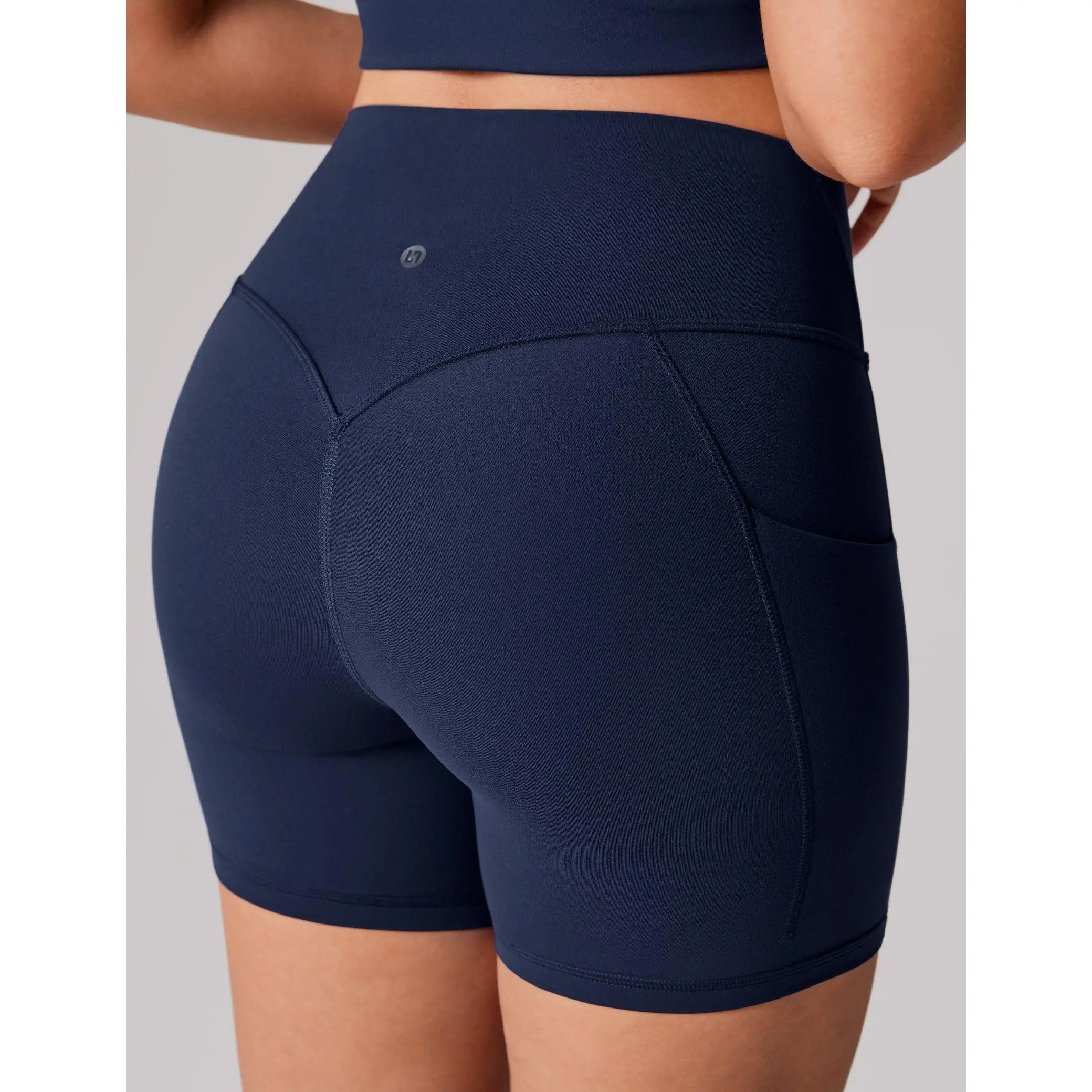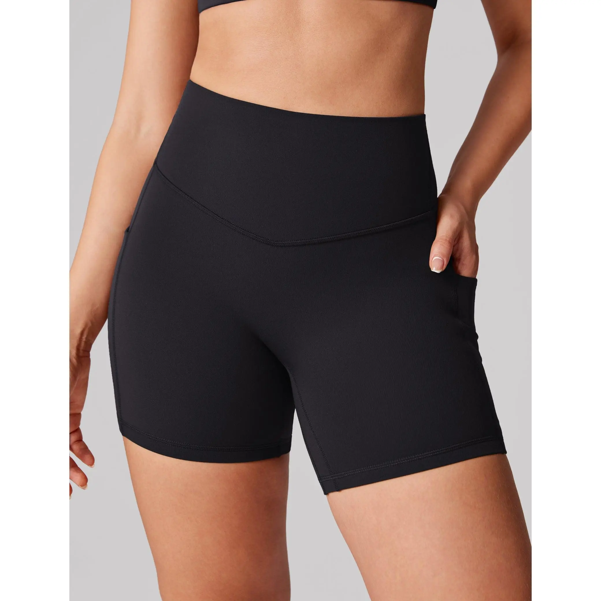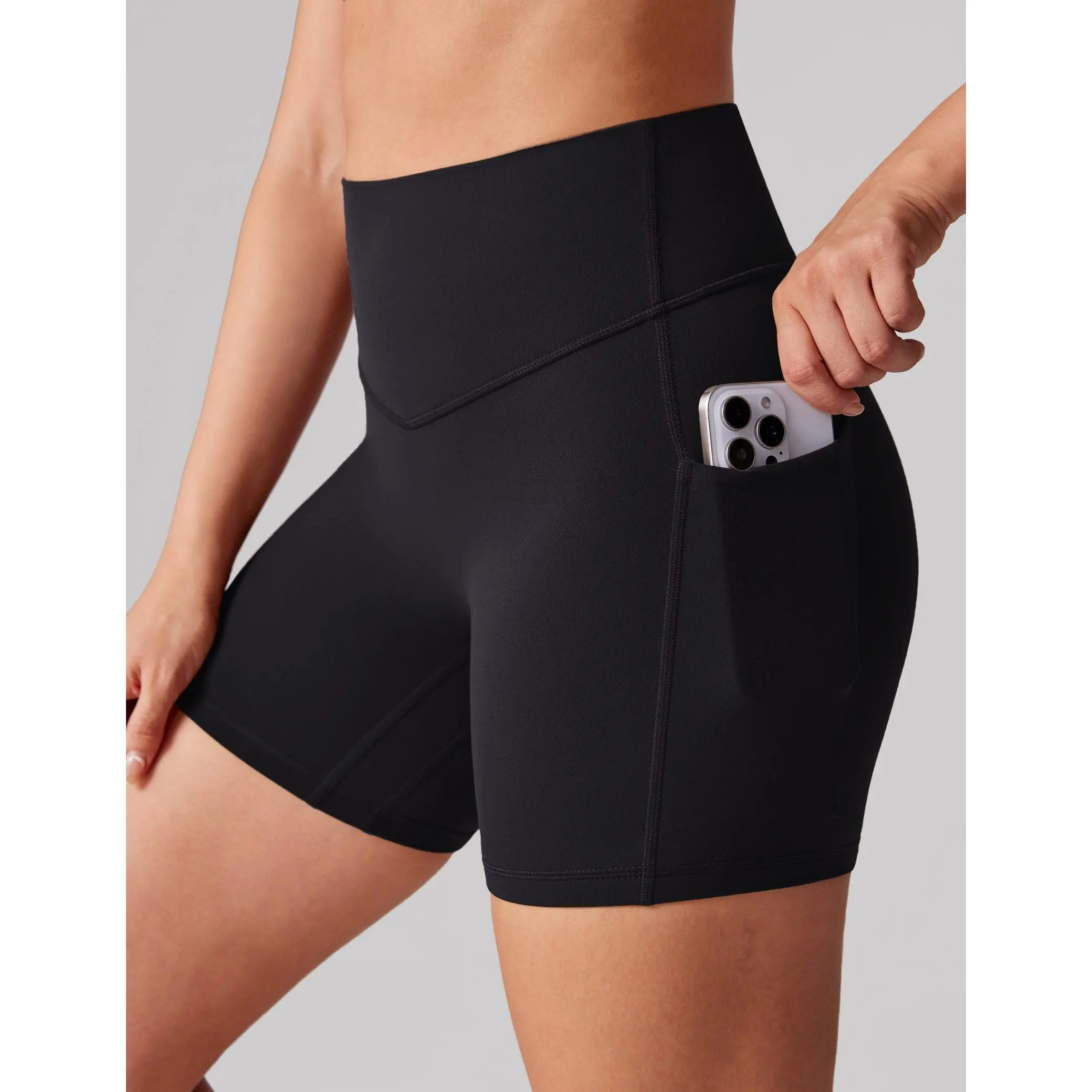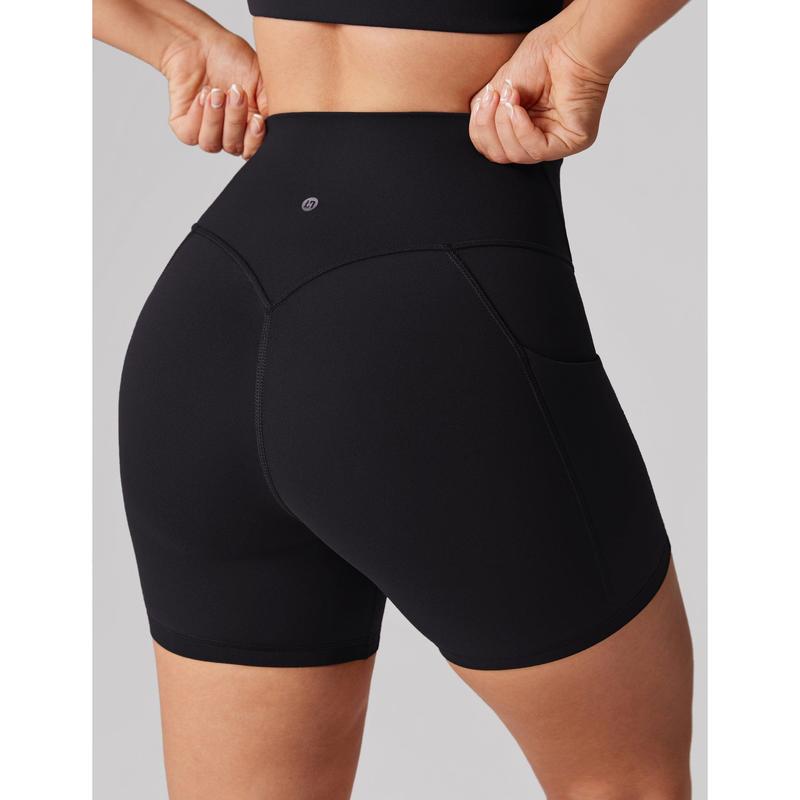 Hugcurve biker shorts 5", a high-waisted design, and tummy support. Featuring side pockets for essentials, the flattering V-shaped waistband and back V-seam enhance your glutes for a sculpted, comfortable fit.