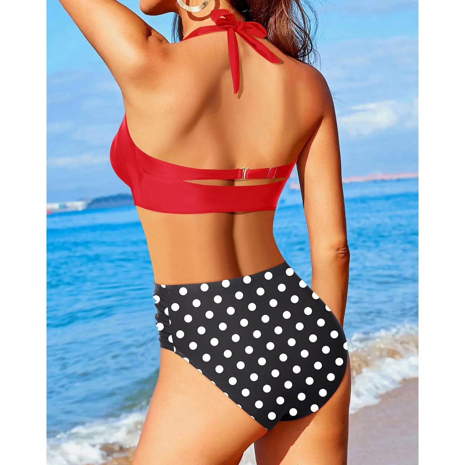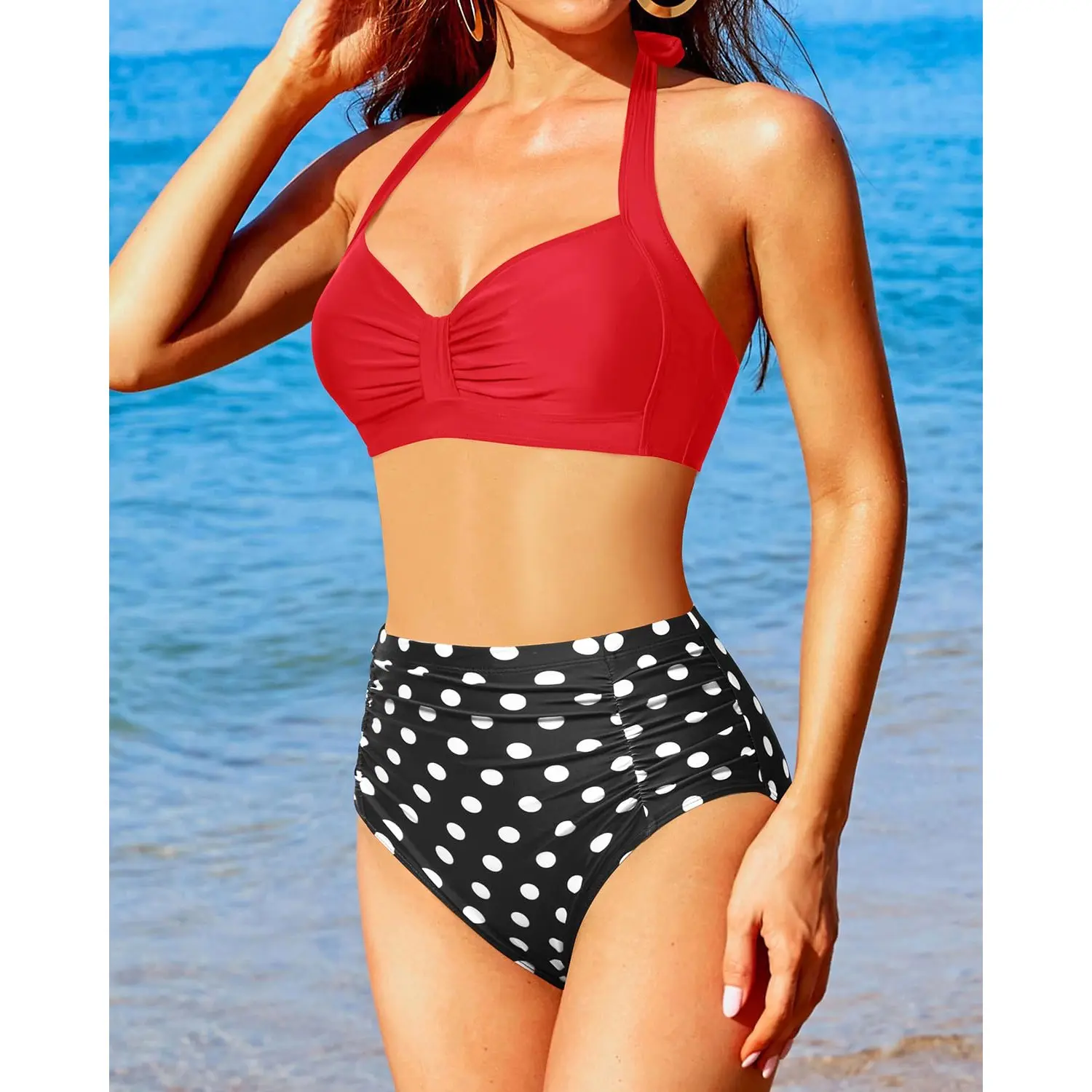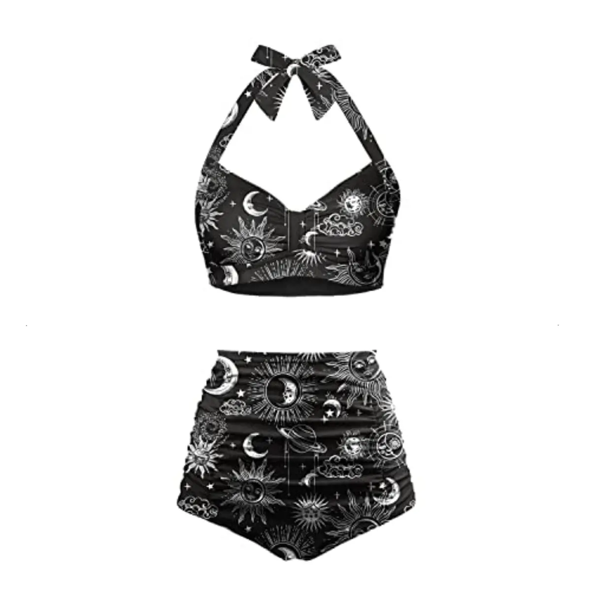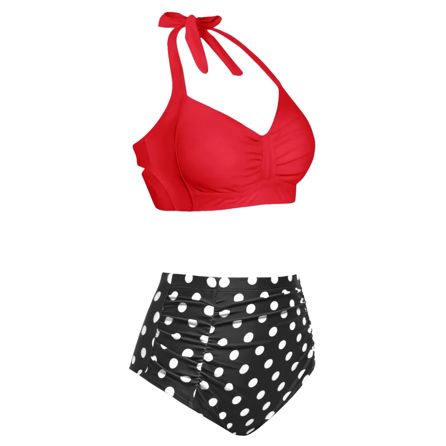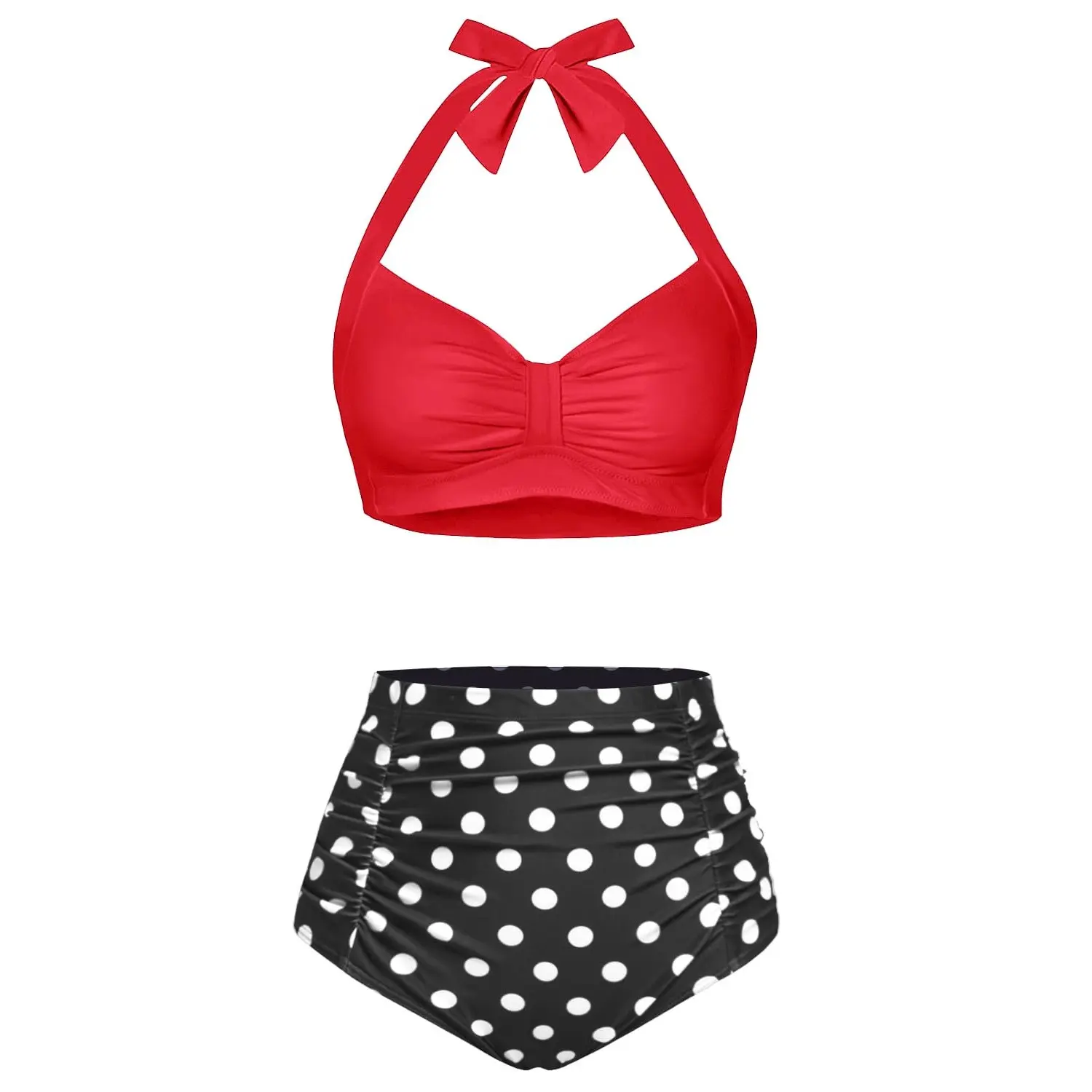 ·This two-piece swimsuit for women features a vintage bikini with a sweetheart neckline, pin-up design, and ruched super high-waisted bikini bottom. The retro 50s style is slimming and perfect for showing off your figure.