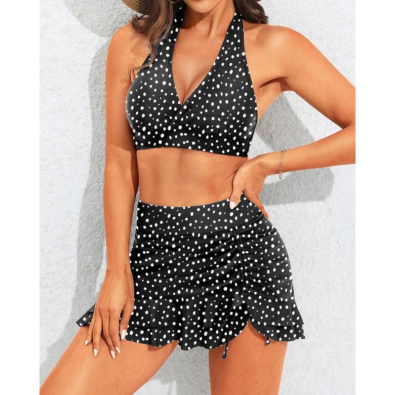 ·Bikini Swimsuit with Skirt: This two-piece bathing suit includes a halter bikini top and a swim skirt. Designed with a V-neck, double ruffle hemline, and side drawstring, it's both cute and unique.