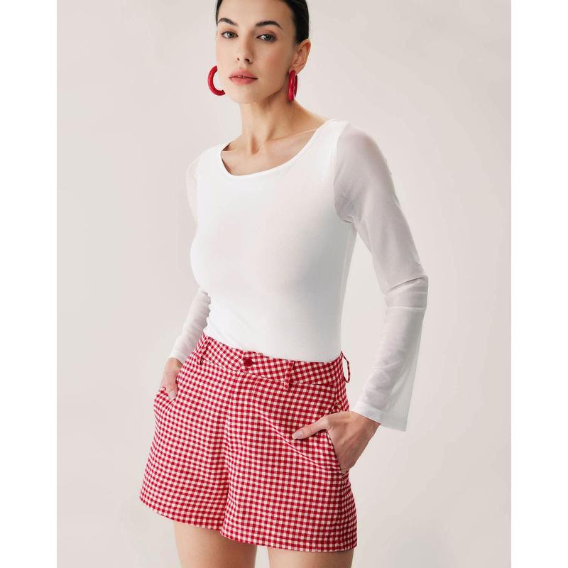 Description: Made from lightweight, breathable fabric, these shorts feature a bold red plaid pattern that stands out. The high-waisted design flatters your figure while offering a comfortable fit, and the functional side pockets add a practical element.