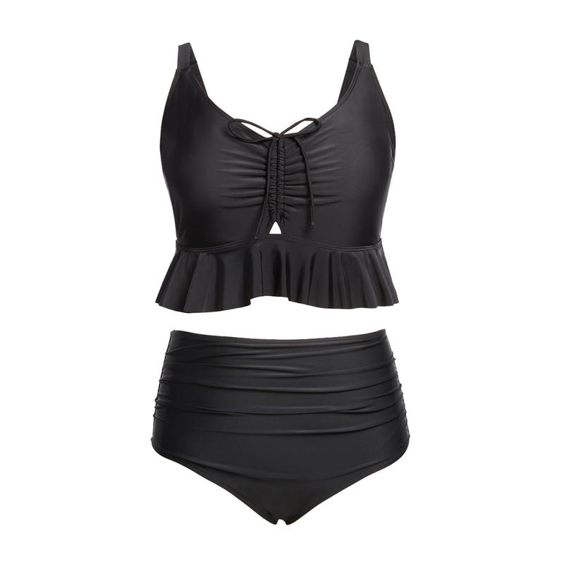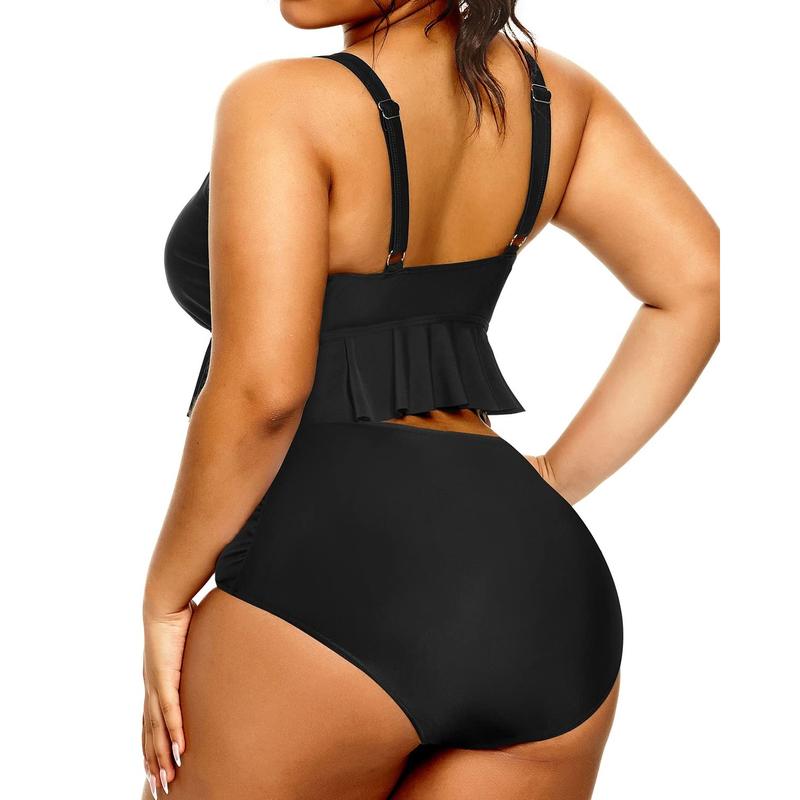 ·Plus Size Two-Piece Swimsuit: The bikini top boasts an adjustable drawstring for a customizable V-neck fit. A chic flounce hem with a keyhole front adds a fashionable touch, while vintage ruffle trim offers extra coverage.