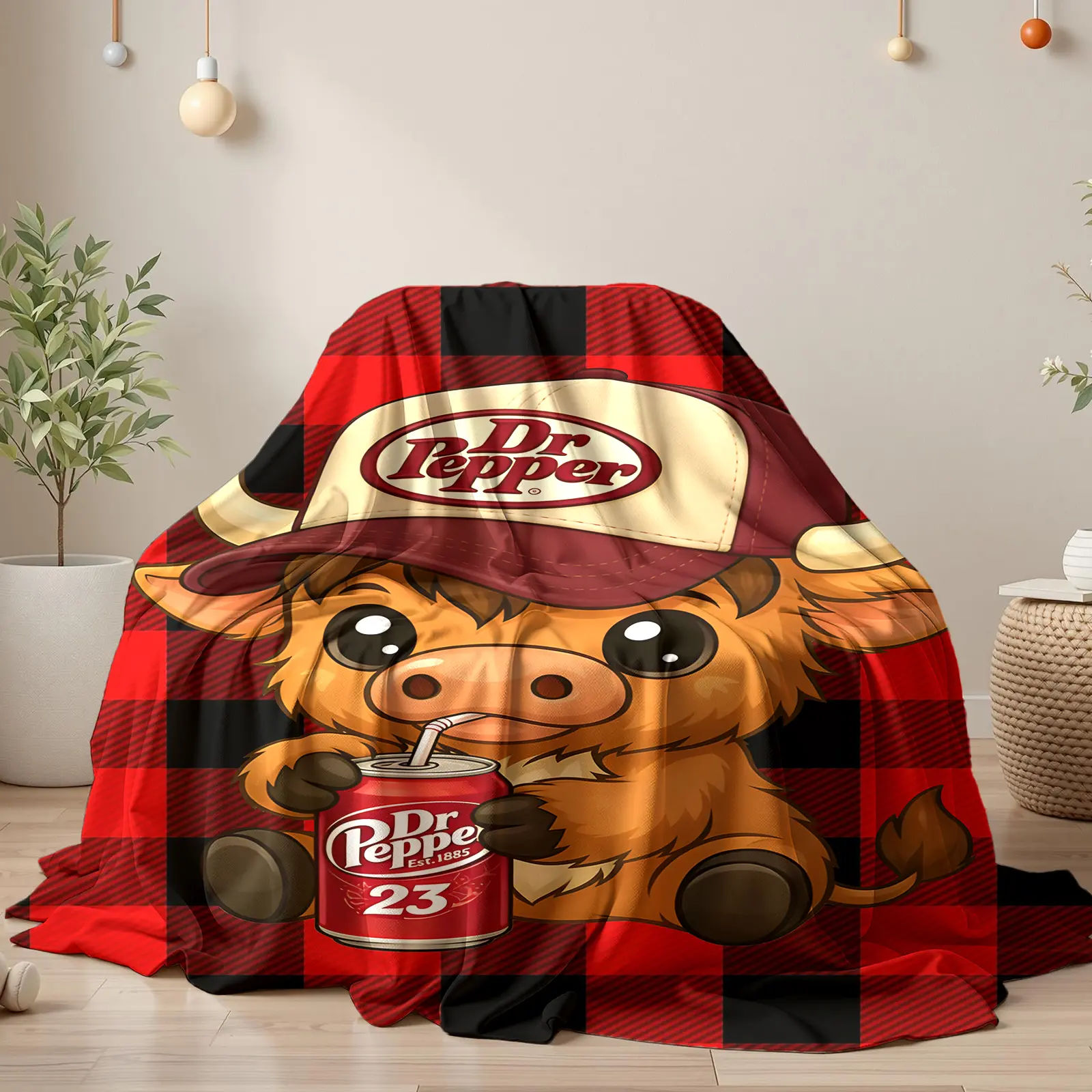 Highland Cow Wear a Hat Cute Pattern Dr Pepper Flannel Blanket,Red and Back Checkered Blanket 1 Count Soft Warming Bedding Blanket Comfy Lightweight Bedding