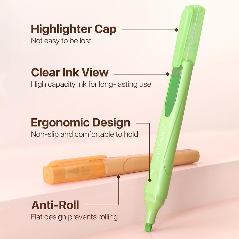 Hand fatigue during long study sessions can be reduced by the ergonomic flat shape. Four Candies book highlighters will not roll off your desk, providing a hassle-free experience. 📚