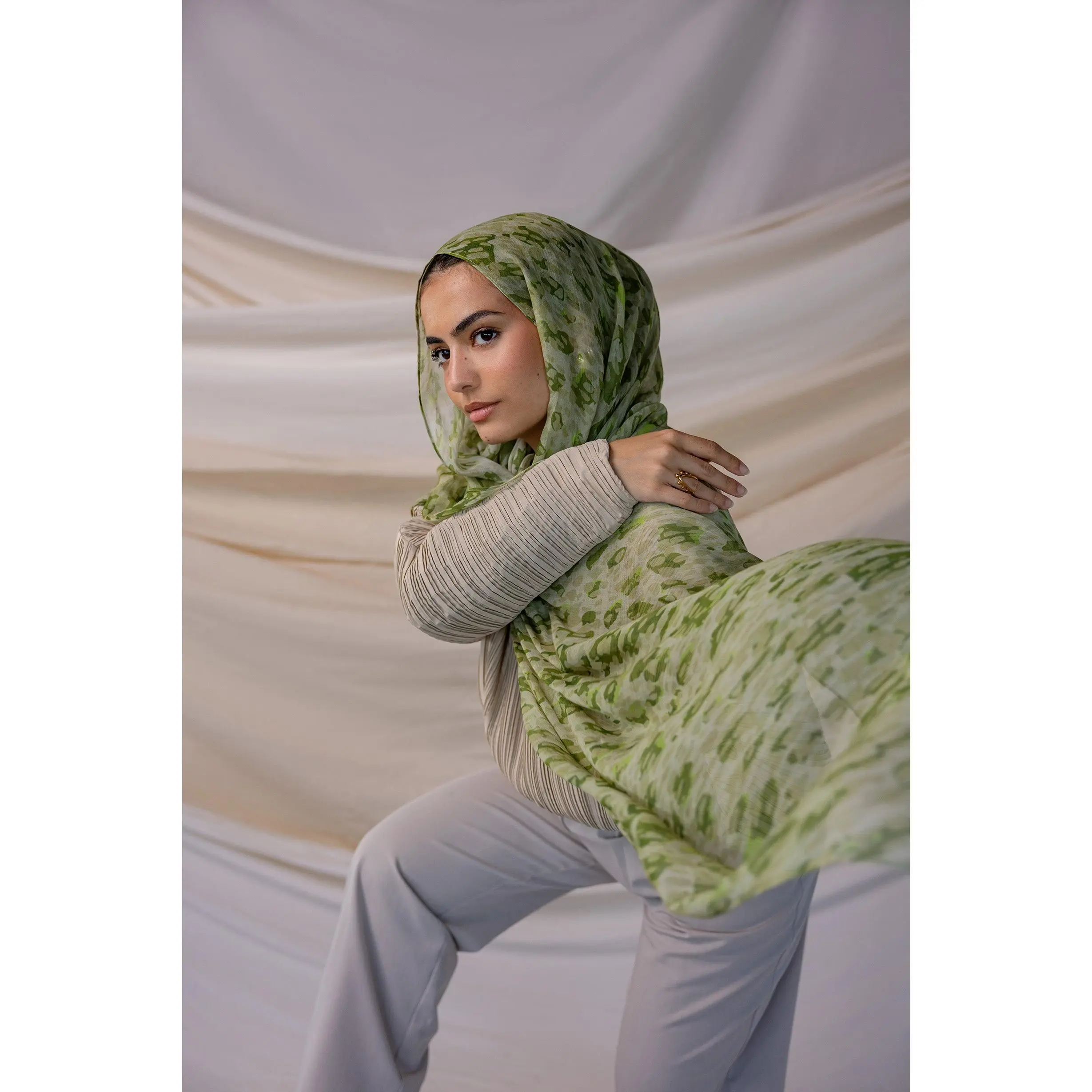 Add a playful twist to your look with the Speckled Green Hijab in our signature modal fabric. This printed modal scarf hijab features a scattered freckle pattern in rich green hues, offering a fun yet sophisticated vibe. The soft, breathable fabric ensures comfort throughout the day, while the unique print adds character to any outfit. Perfect for those seeking a touch of whimsy with a modern edge, this speckled Green hijab is also available online.