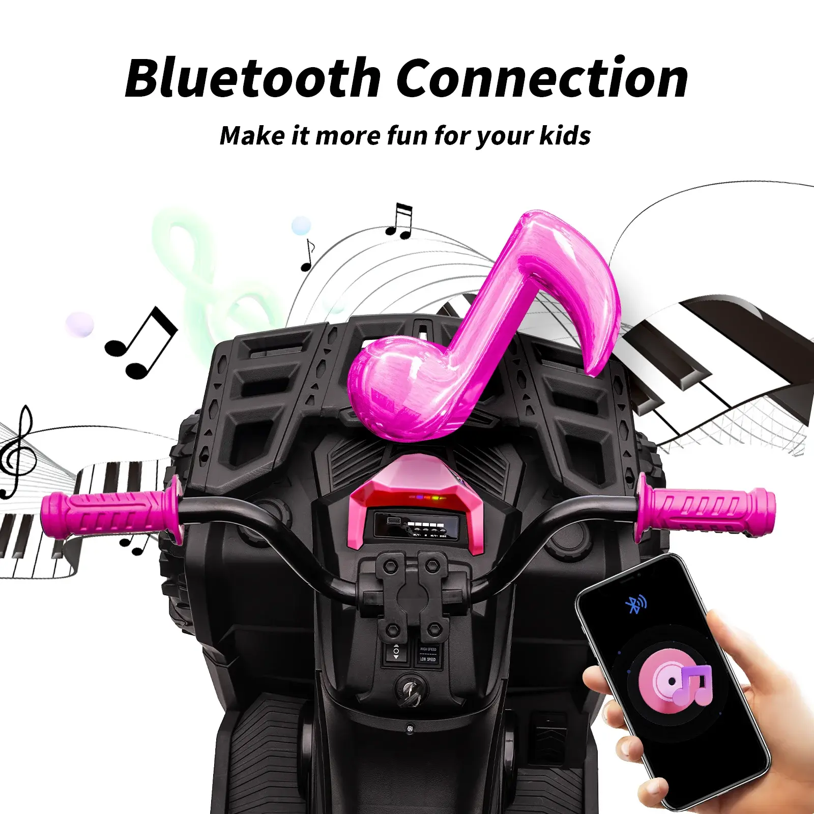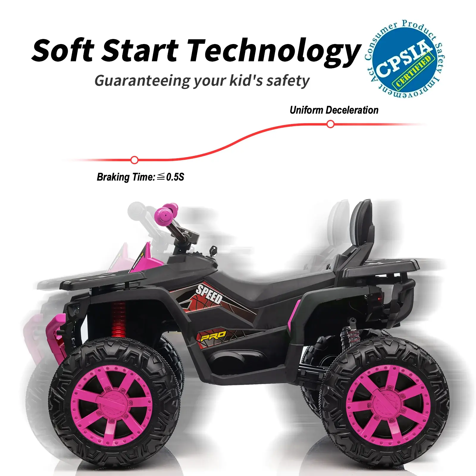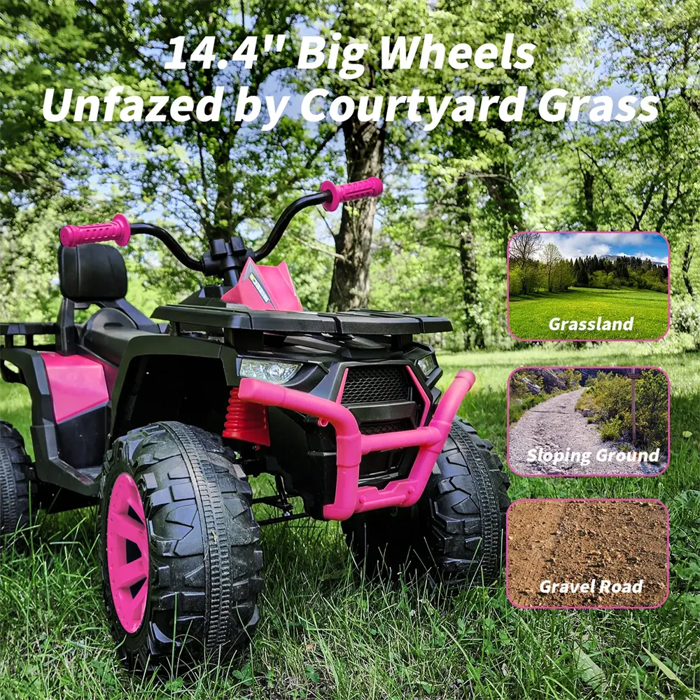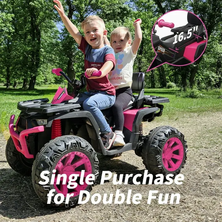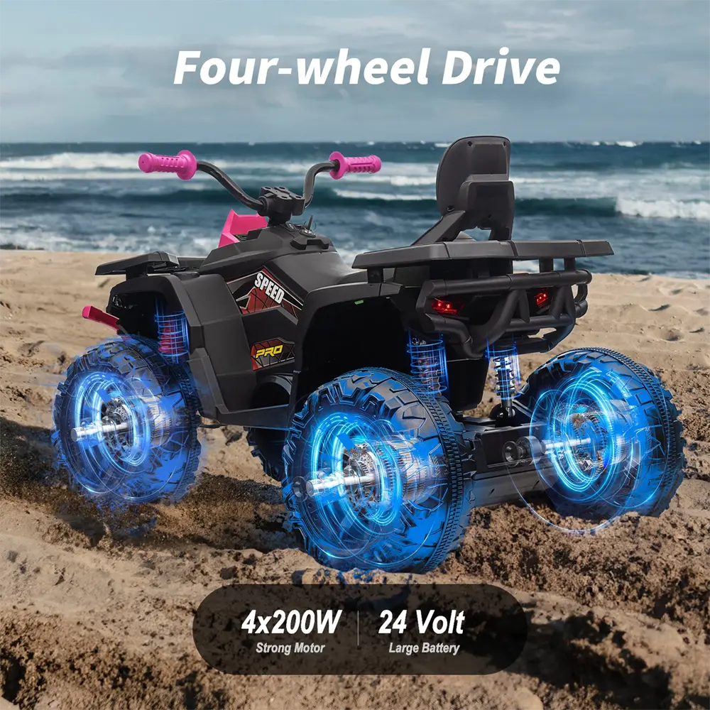 Let's unleash the spirit of adventure with Hikiddo groundbreaking 24v 4WD ride on kids atv four wheeler! Our latest model of 24 volt ride on toys for big kids with 2 seater, boasting 800W powerful motors, is capable of reaching thrilling max speeds of 5.6mph. Embracing the spirit of childhood, we've adorned the exterior with eye-catching design in this electric 4 wheeler ride on toys. More than just visually appealing, our battery operated ride on atv toy cars for kids to ride in is also equipped with Bluetooth and USB connection, allowing young riders to soundtrack their adventures with their favorite tunes, fostering an immersive experience. Elevating the thrill, this high chassis 24 volt four wheeler for girls boys aged 3-7 years old features four 14.4" large tires and spring suspension system, which ensures smooth riding while maintaining safety.