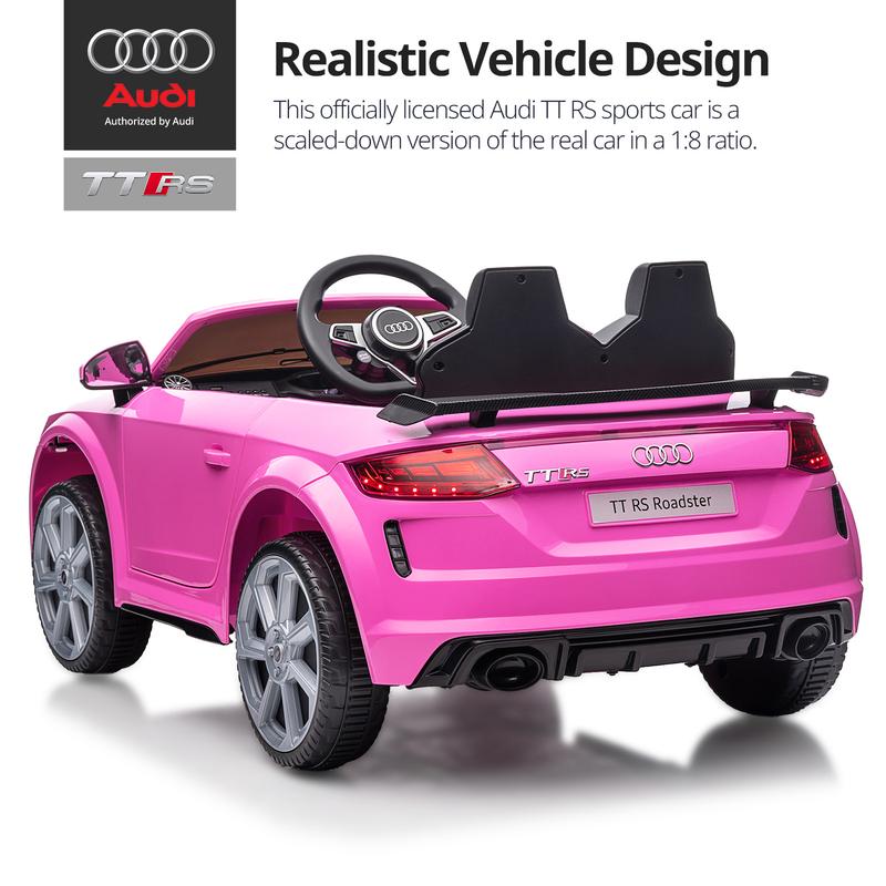 The Hikiddo kids ride on toy is designed by Licensed Audi TT RS in a 1:8 ratio that will bring endless joy to your kiddos. Our electric car for kids have forward and back mods of low or fast speed, children will get real driving through the pedal and steering wheel, and the operation is very easy for boys and girls. Of course, parents can control the riding toys through the remote and participate in the fun with their little ones. The 12V ride on toys feature abundant configuration, with built-in music, USB port, front and rear headlights, and shock absorbers, these will not only make kids' riding more funny but also ensure safer driving. The ride on cars with remote control will be perfect gifts, kids will definitely fondle admiringly!