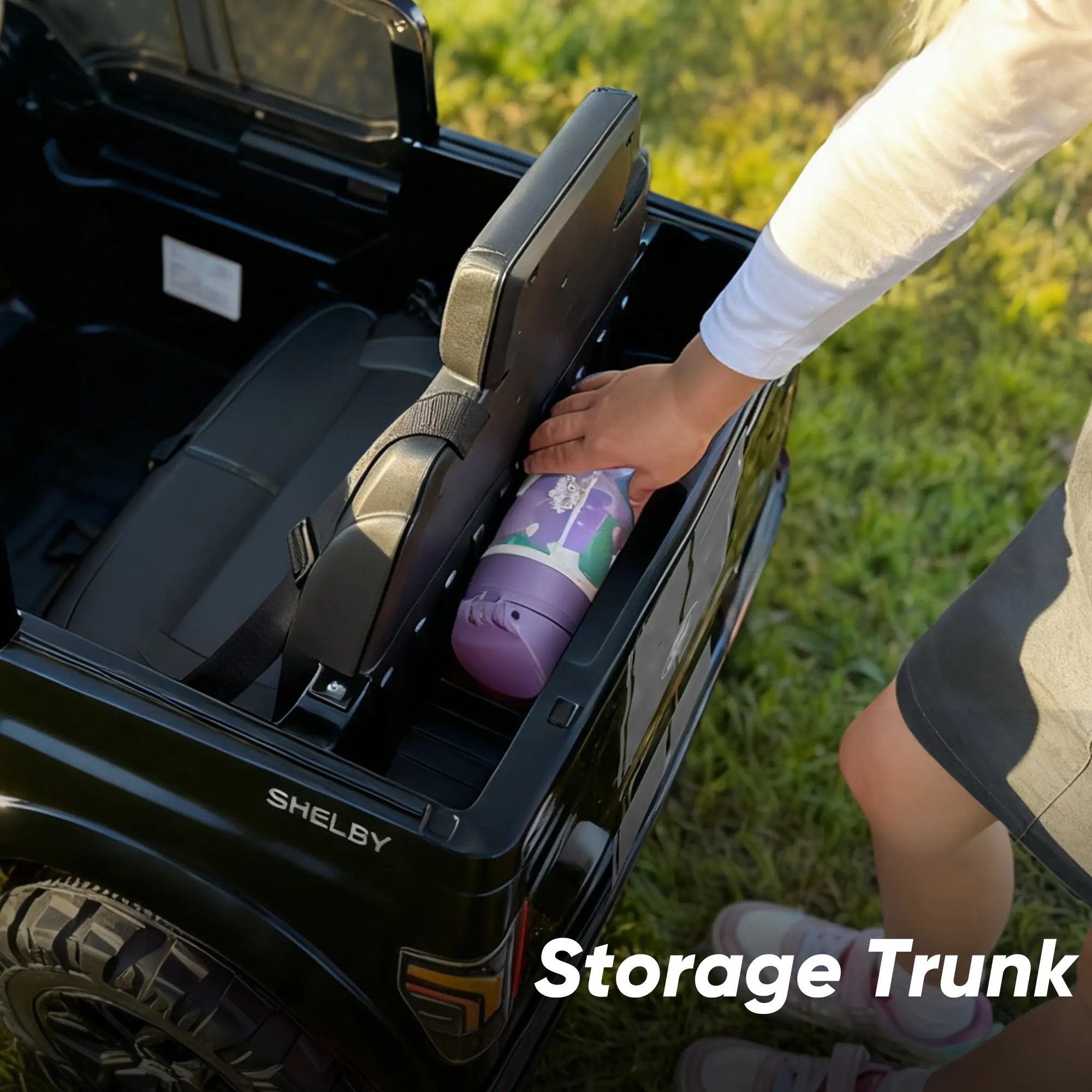 Includes a functional trunk space for convenient storage of toys
