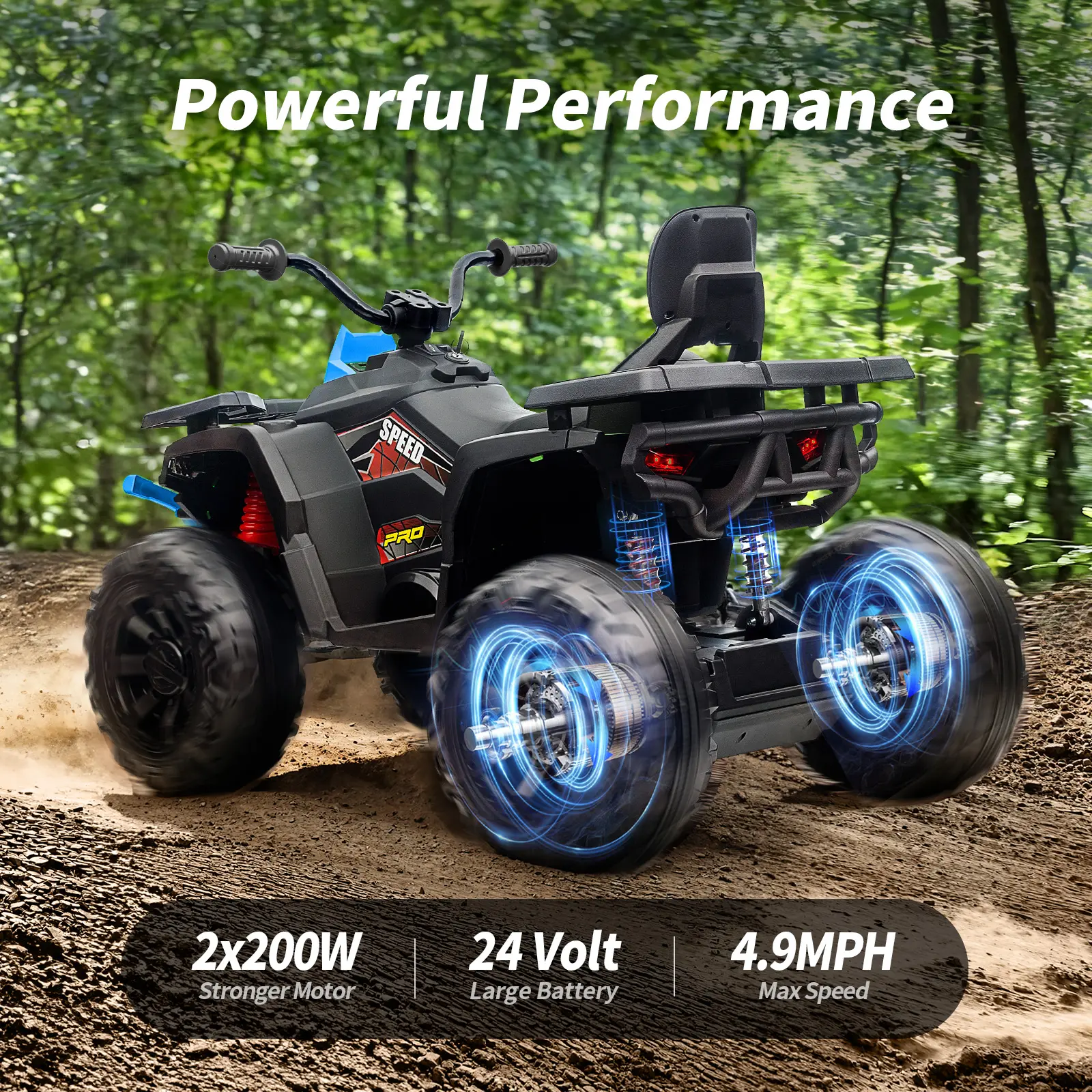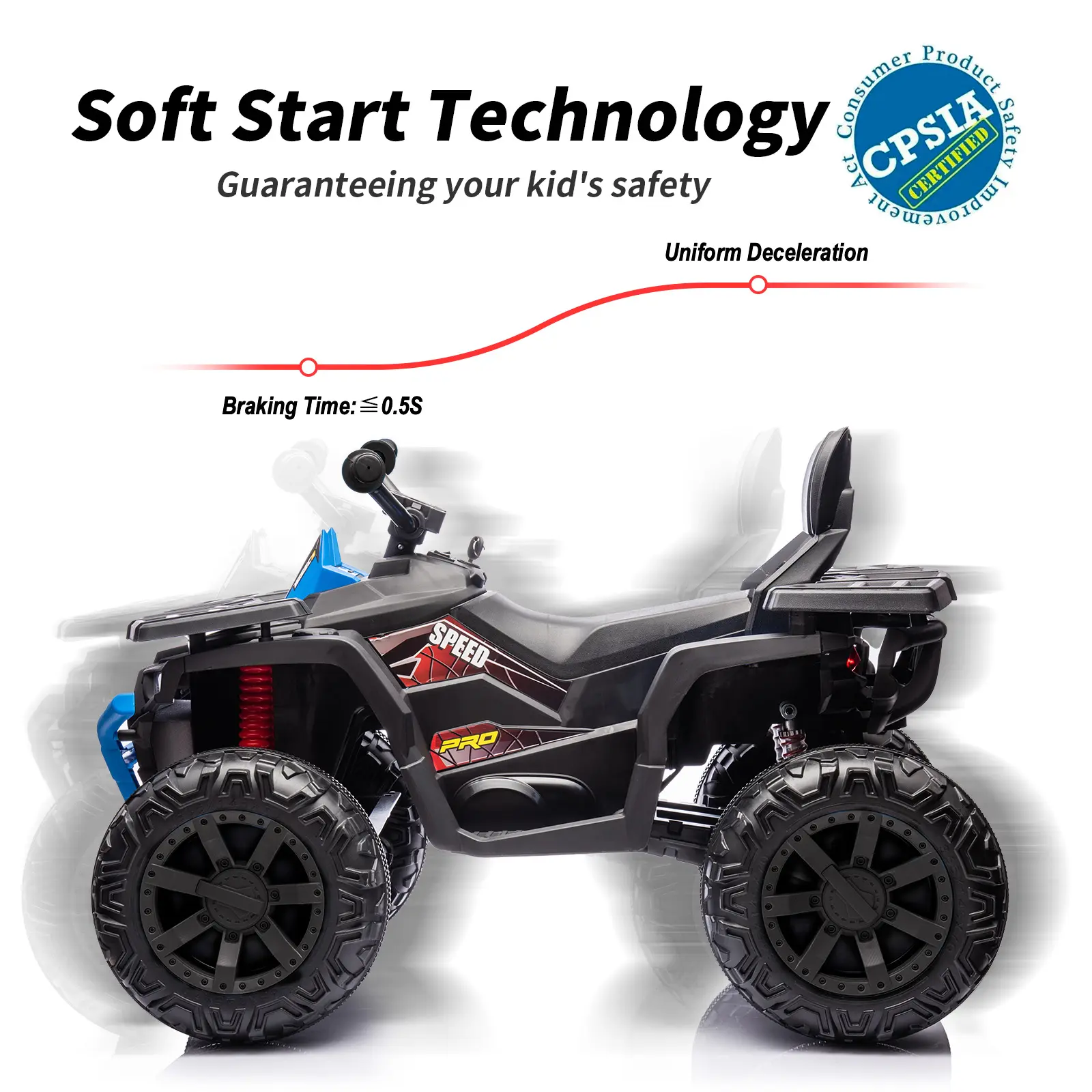 SAFETY IS A TOP PRIORITY: This 24v quad is equipped with spring suspension shock absorbers for a smooth ride. And the soft start technology ensures gradual acceleration to guarantee your kid's safety on the road.