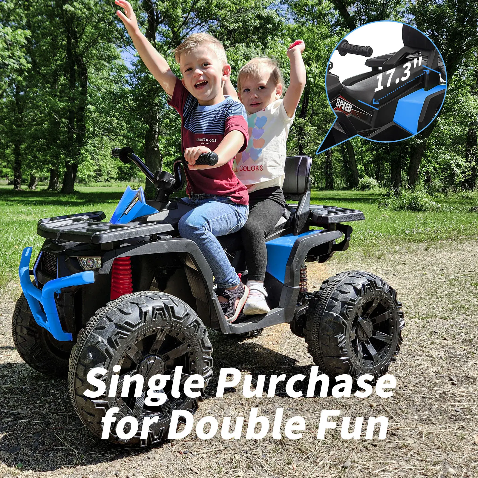 EXTENDED SEAT FOR 2 CHILDREN: Our Hikiddo two-seater toy four wheeler can accommodate two kids simultaneously. With a weight capacity of up to 77 lbs, this 24 volt 4 wheeler is designed to fit your child's body shape, offering a comfortable driving experience.