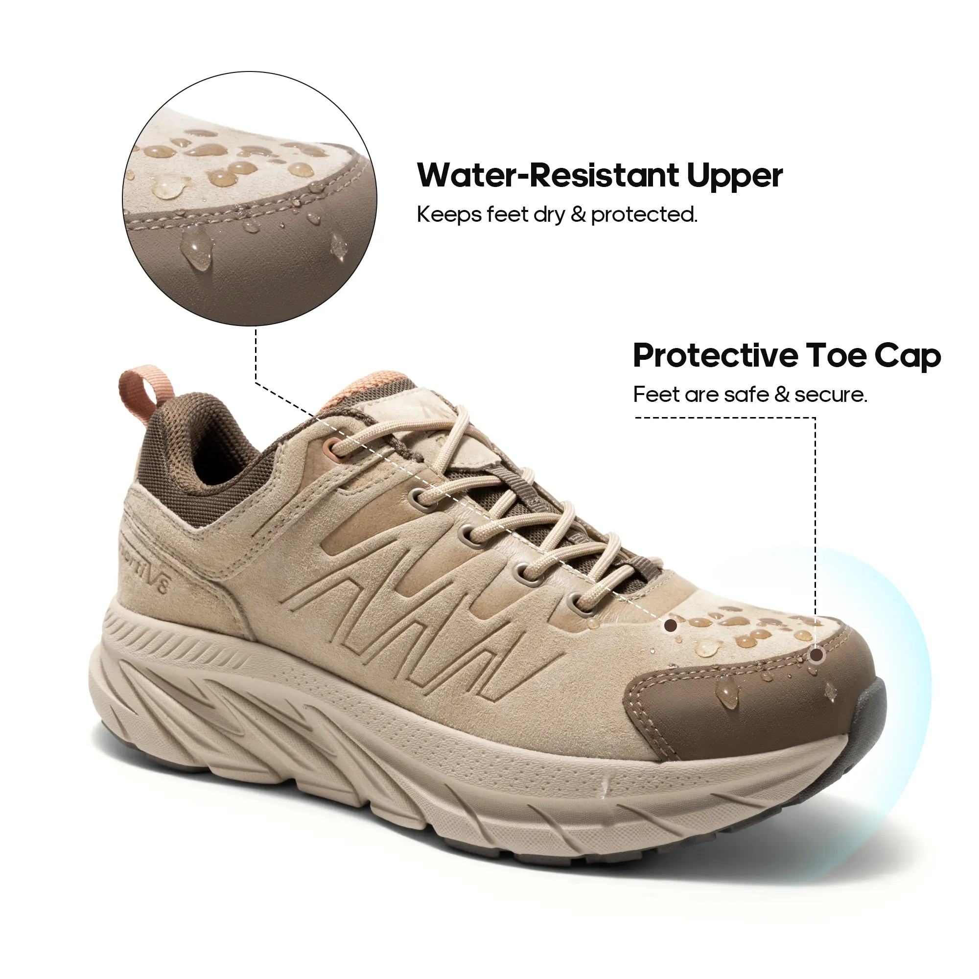 ·Durability & Protection: These women’s hiking shoes are constructed using pigskin leather, ensuring both softness and long-lasting wear. The water-resistant upper keeps your feet dry in light rain, while the gusseted tongue effectively blocks out debris.