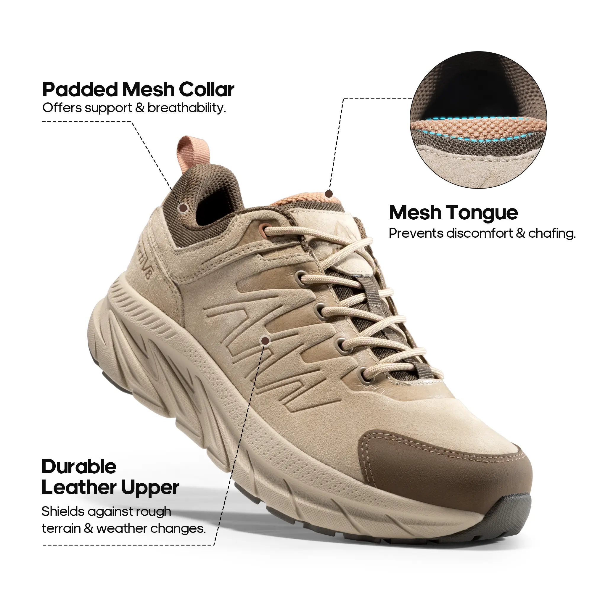 ·Extra Comfort: The collar and tongue of these trekking shoes are crafted from breathable mesh material, while the tongue's inner and outer design enhances overall wearing comfort and reduces the risk of blisters.