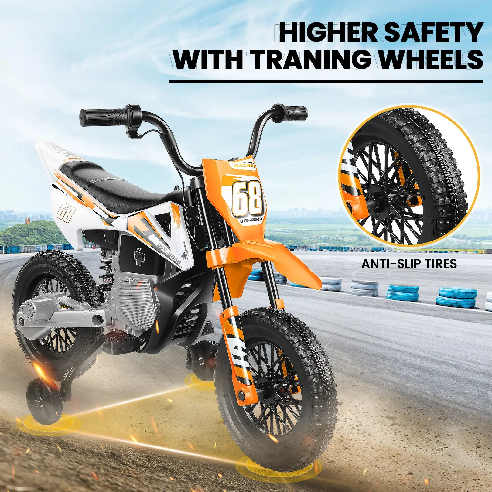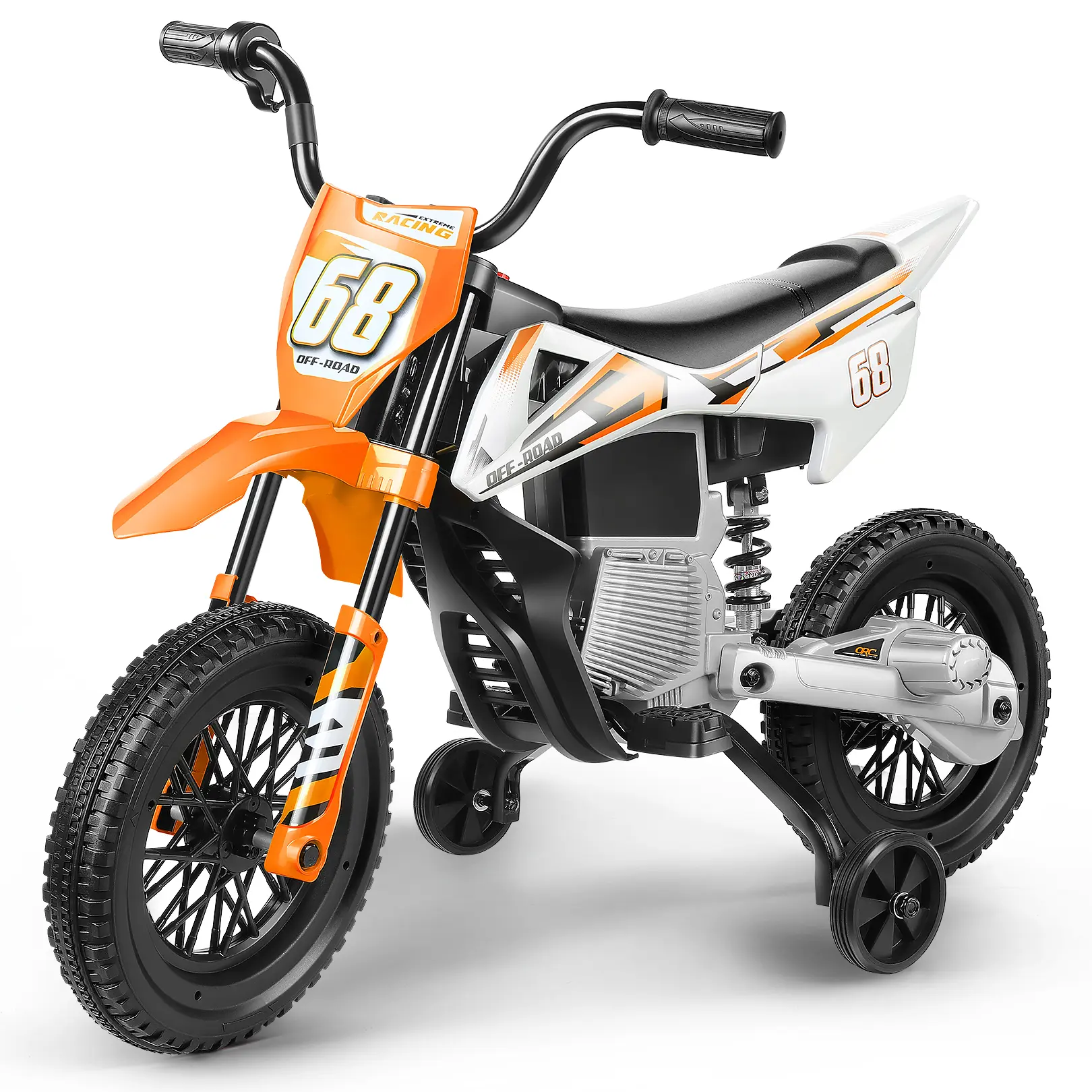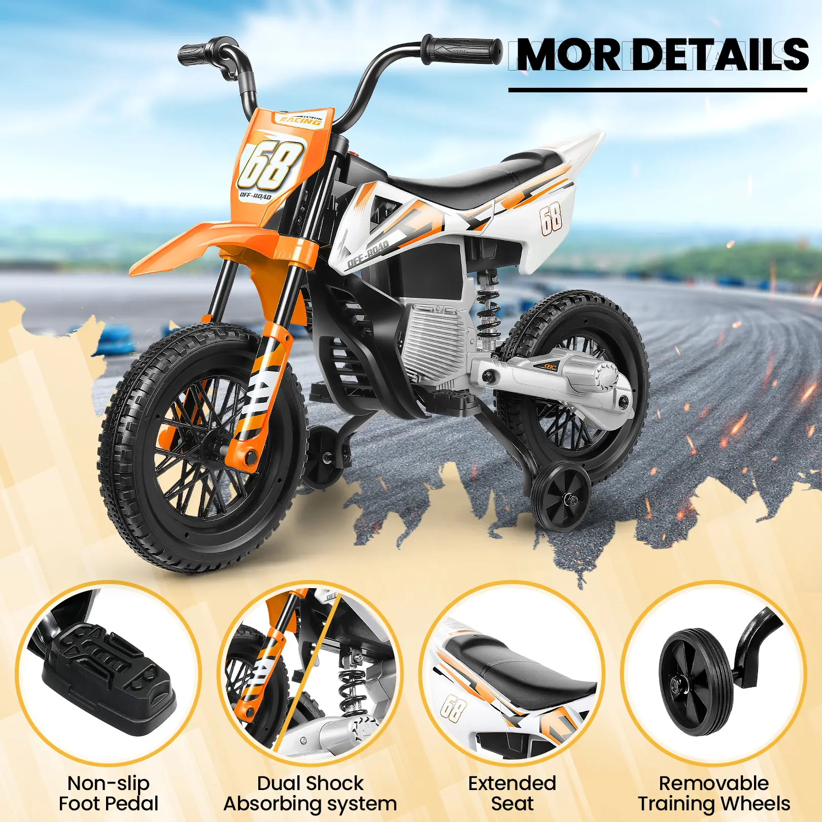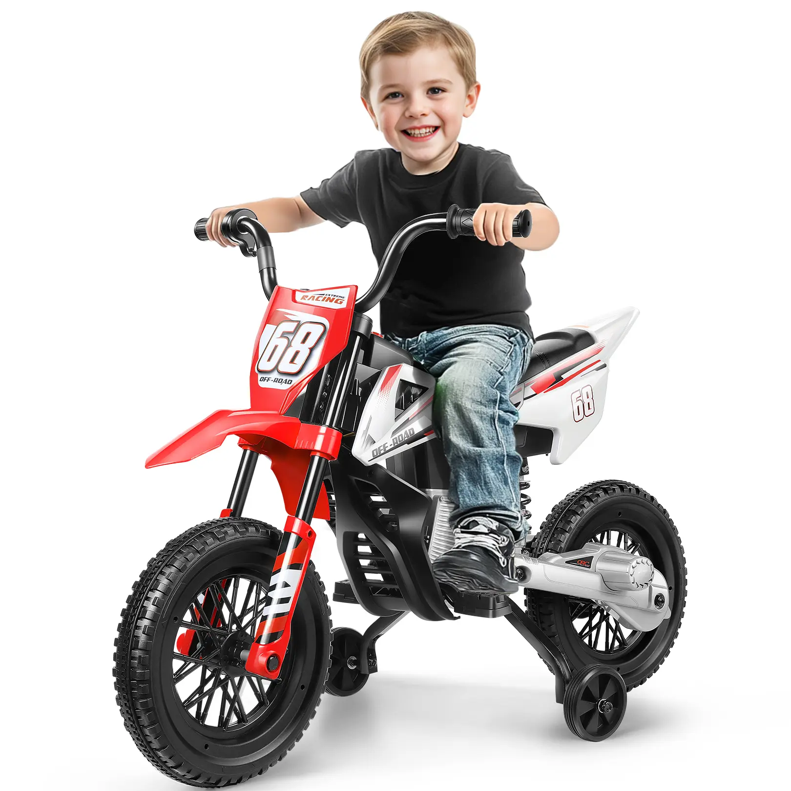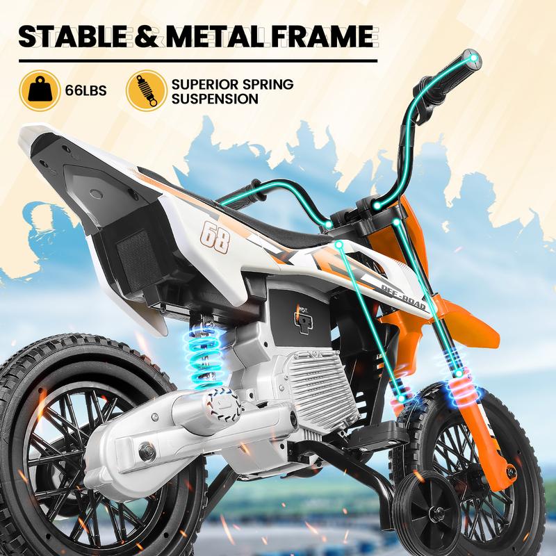 ·Extra Stable Training Wheels for Beginners — Specially designed as an Electric Training Wheel Dirt Bike for kids ages 4–6, this ride-on motorcycle includes two wide training wheels to help beginners stay balanced and confident. The spring suspension system reduces bumps, making every ride smoother and safer for young riders.