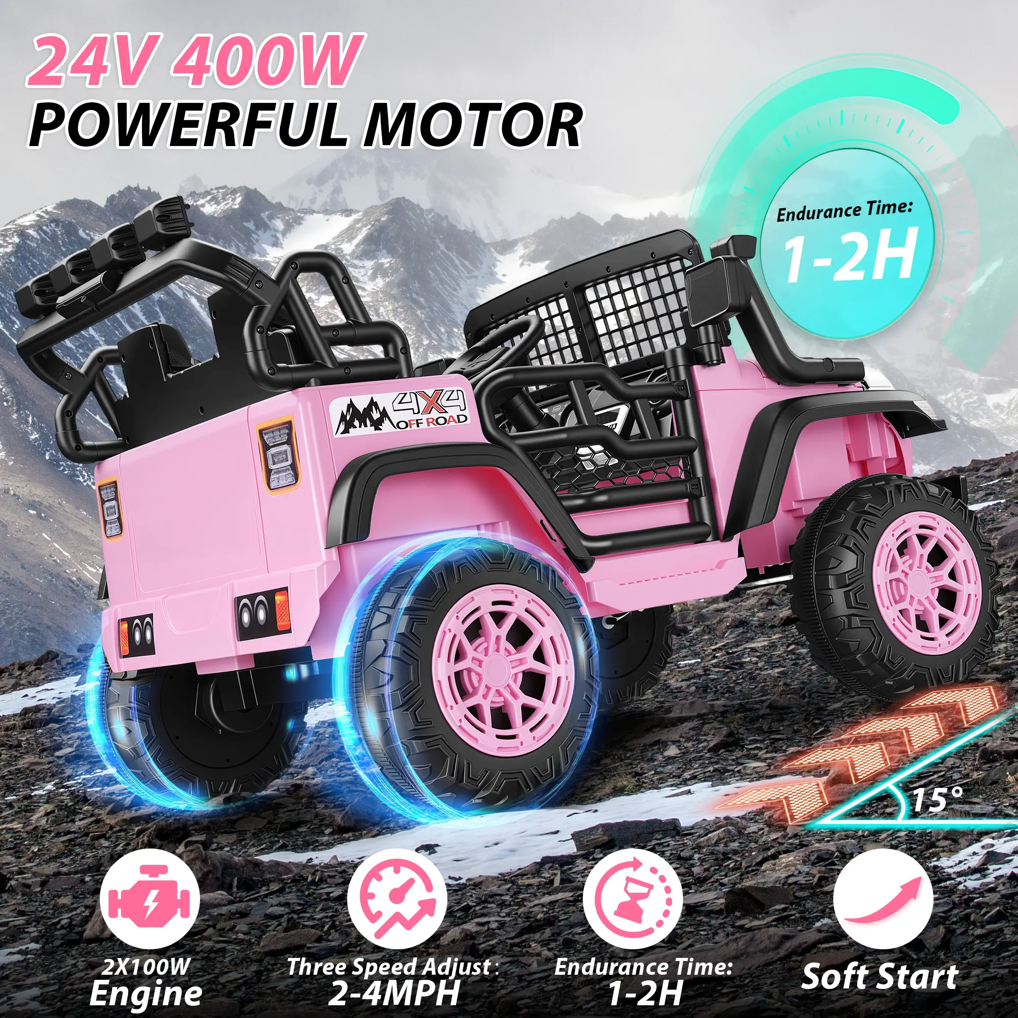 ·Powerful 24V Battery & Extended PlaytimePowered by a reliable 24V rechargeable battery and dual 200W high-performance motors, this 2-seater ride-on car delivers up to 1–2 hours of continuous play. It performs smoothly on grass, concrete, gentle slopes, and backyard terrain—turning every ride into a new adventure.