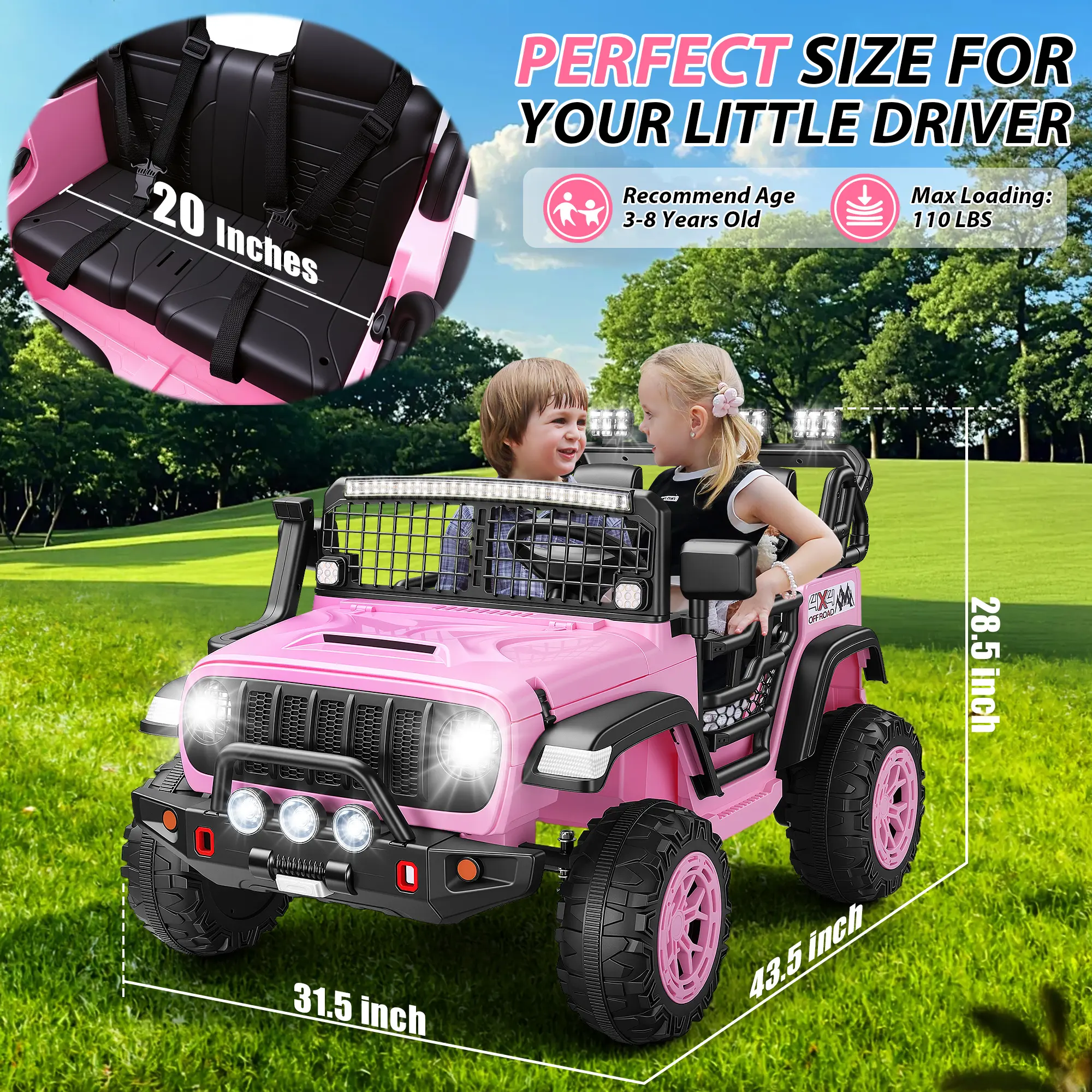 ·Built for Sharing: Spacious Two-Seater FunWith generous dimensions of 44.7" L × 31.5" W × 28.9" H and a roomy 20-inch wide two-seater seat, this 24V kids electric car comfortably fits two children ages 4–8. Perfect for siblings or friends to ride together, doubling the fun and shared adventure time.