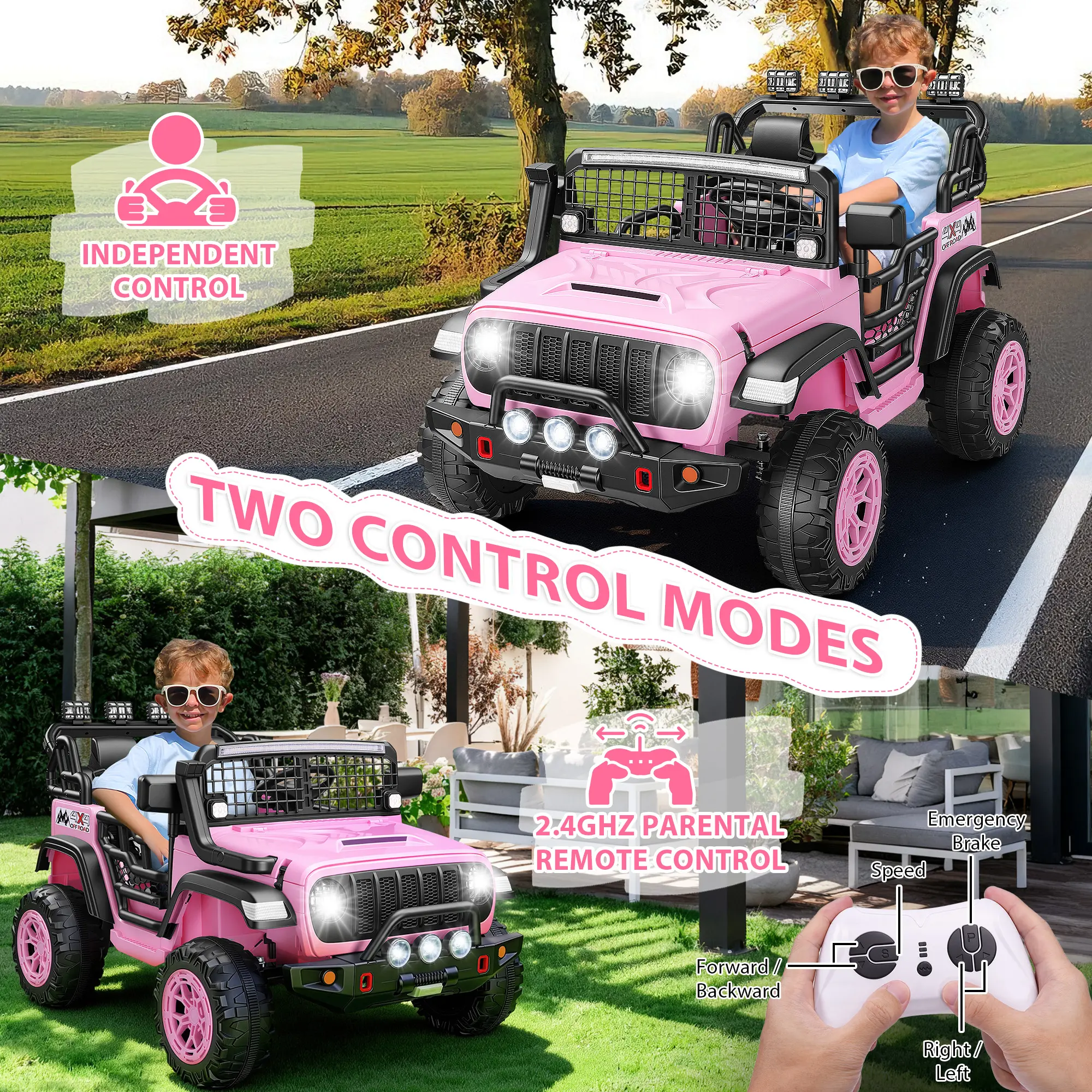·Parent-Controlled & Independent Driving ModesDesigned with dual driving options, this ride-on car features three adjustable speeds (2–4.5 MPH). Kids can drive independently using the steering wheel and foot pedal, while parents can take full control anytime with the included remote for added safety and peace of mind.