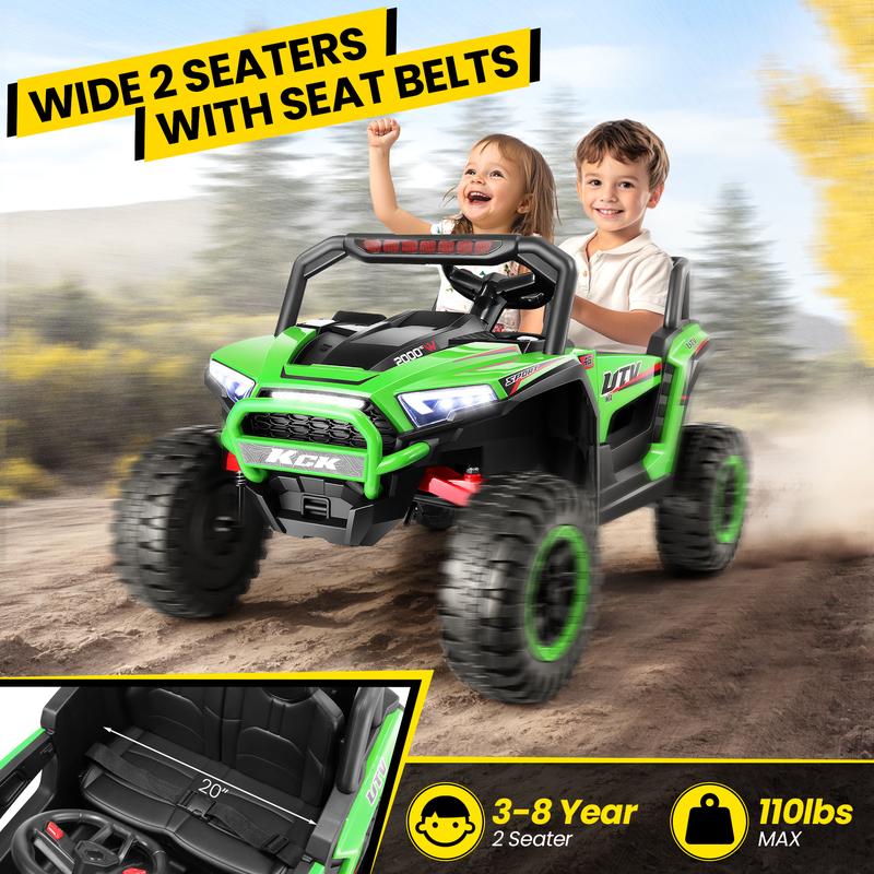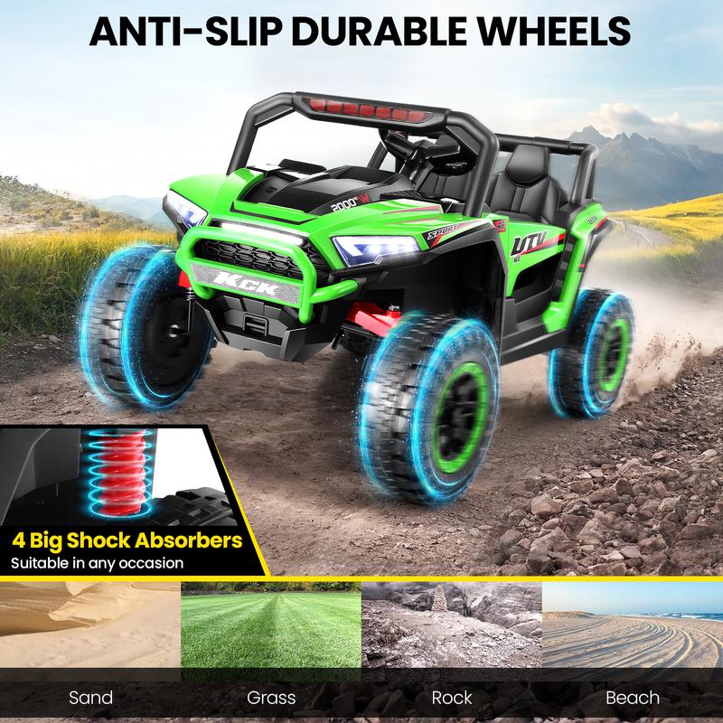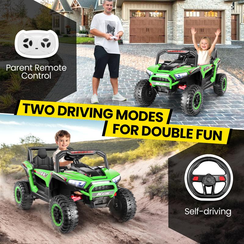 ·【High/Slow Switchable Powerful Motors】Hikole Battery operated Kids UTV equipped with a 24V battery 7AH powerful motors, Four EVA non-slip big wheels with clear wear-resistant patterns.. This truck can easily cross various terrains in High Speed Mode. Or switch to Slow speed mode for low-speed cruising and extended battery life, providing a realistic driving experience.