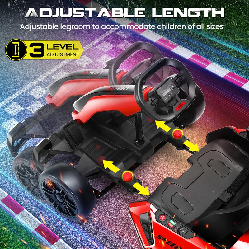 Features a 3-stage adjustable seat ranging from 20.75" to 26.5", ideal for kids aged 6–12. A length adjustment button on the chassis allows the kart to expand as your child grows. Supports riders up to 110 lbs.