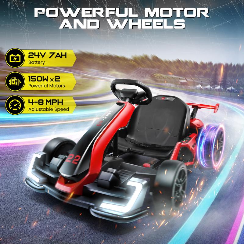 Equipped with a powerful 24V 300W high-torque motor, this electric go-kart reaches speeds up to 8.5 MPH, delivering real drifting excitement. Choose between Sport and Drift modes (High & Low speed options), making it perfect for both pavement and grass. Enjoy 1–2 hours of runtime at full load.