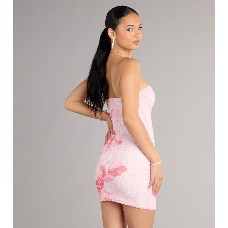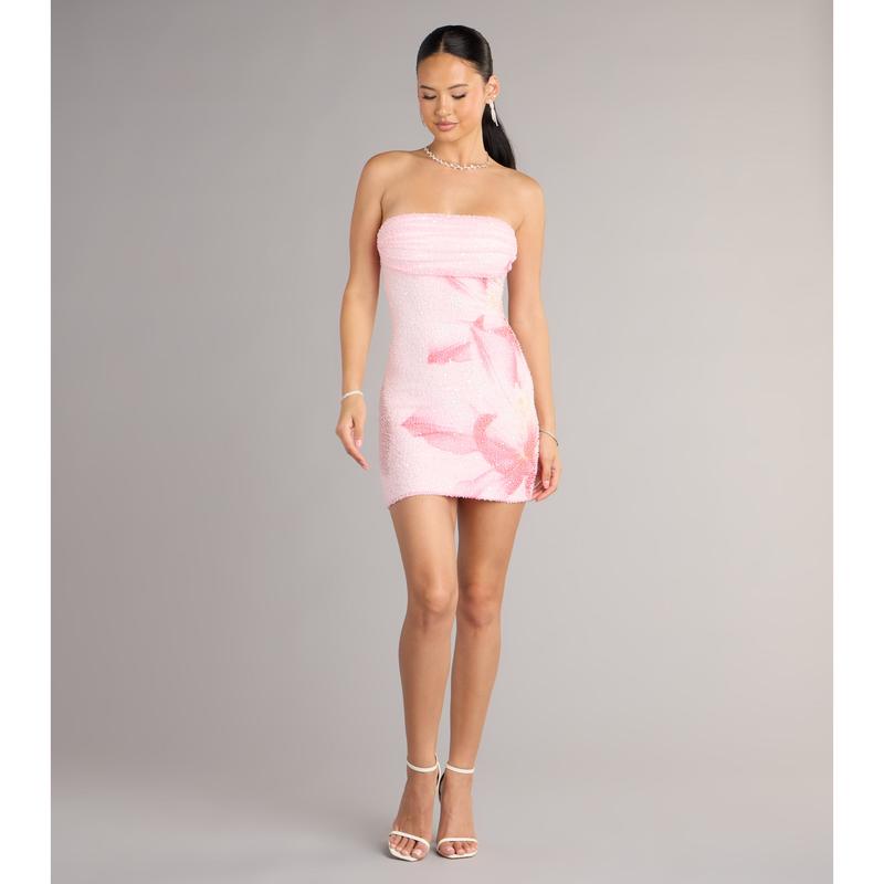 The Hilary mini dress is pure getaway glamour, made for warm nights and dance-floor lights. Intricate beading shimmers over a tropical floral motif, while the sleek cowl tube neckline and curve-hugging mini silhouette bring sultry sophistication to any occasion.