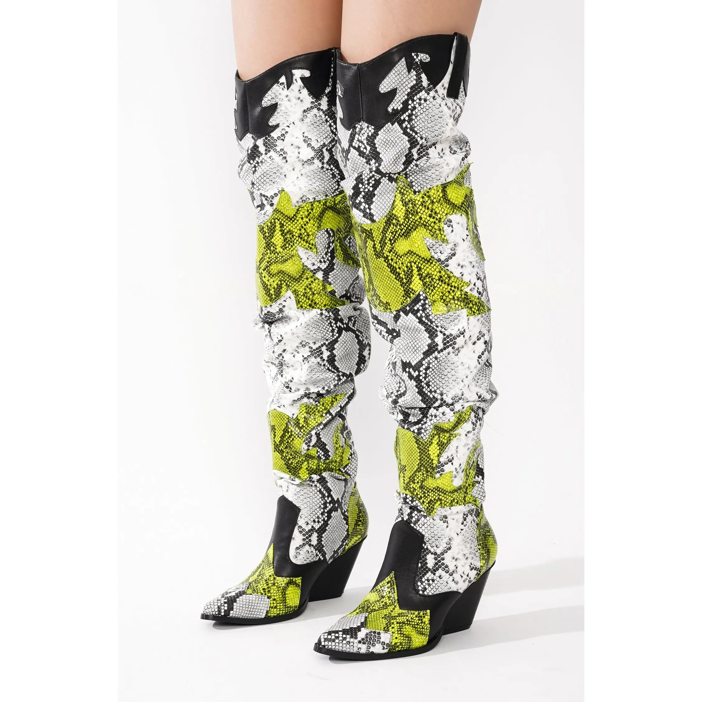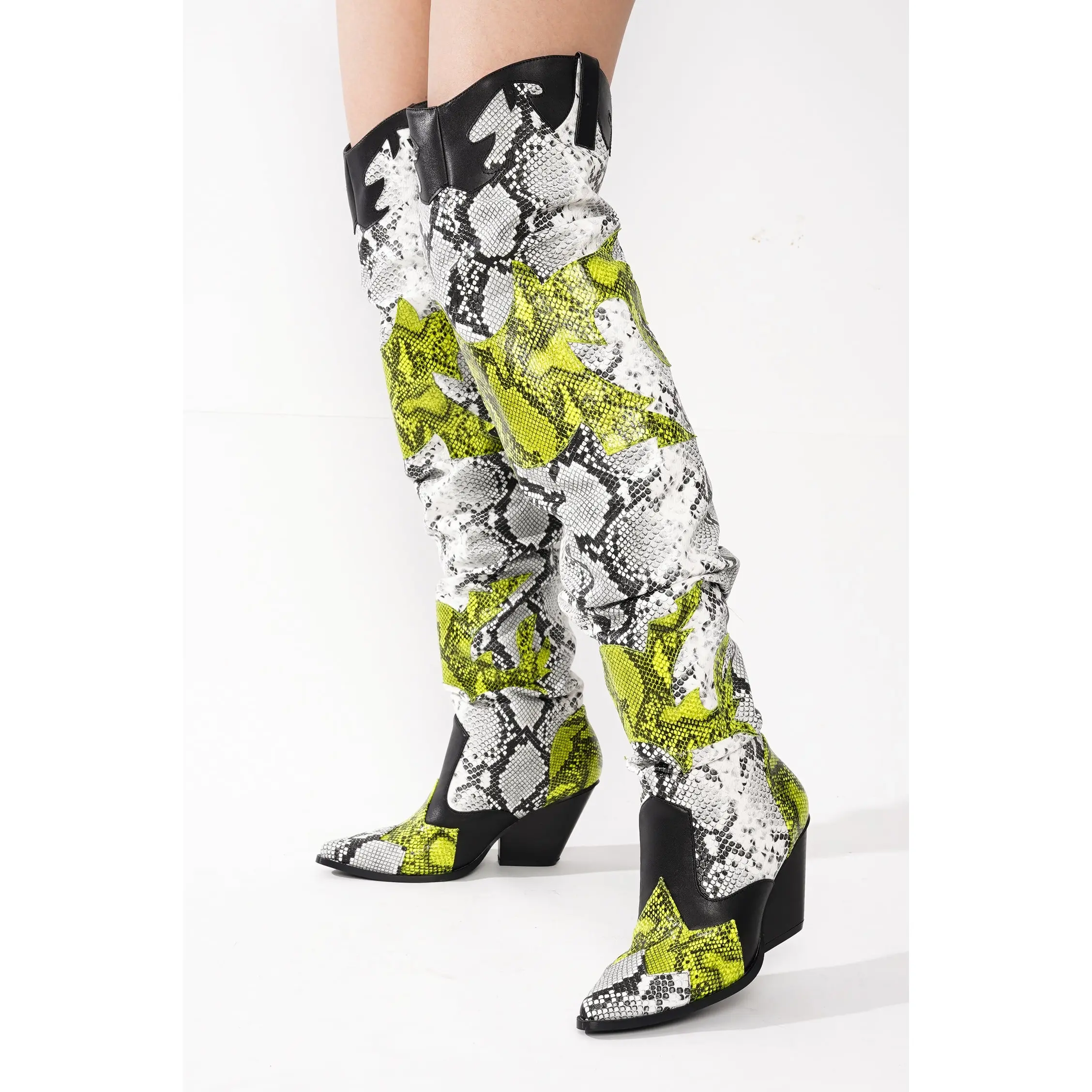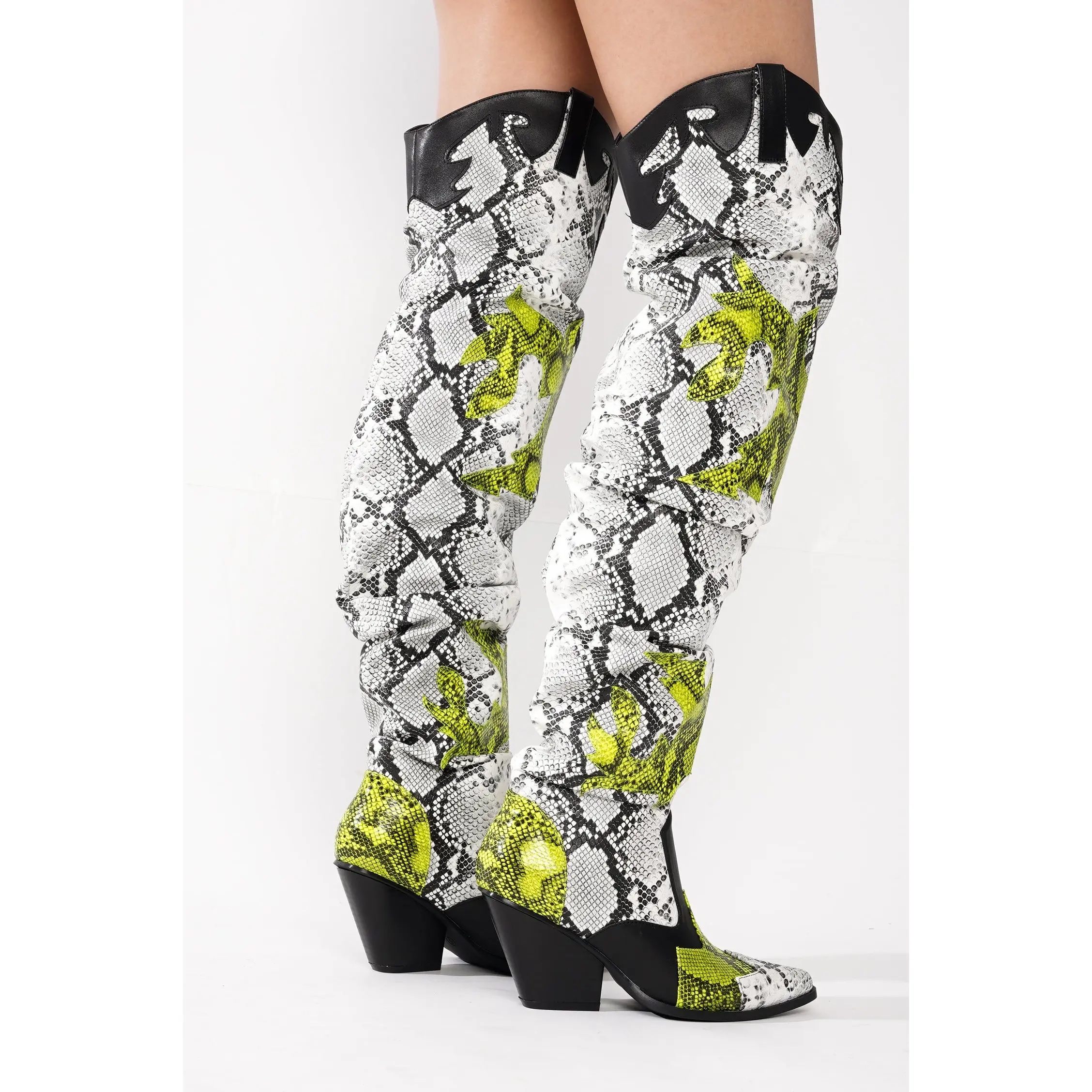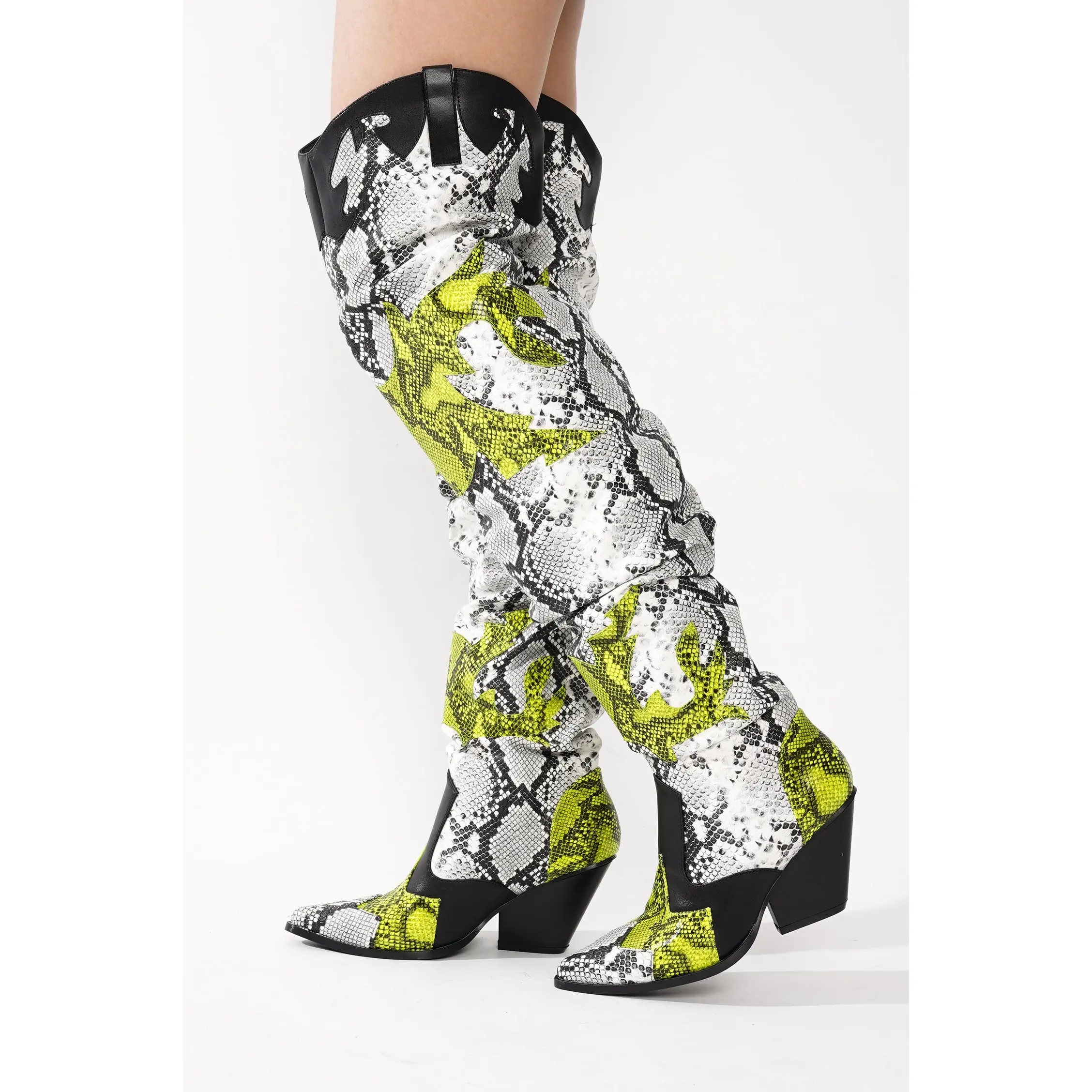 𝗘𝘆𝗲-𝗖𝗮𝘁𝗰𝗵𝗶𝗻𝗴 𝗦𝘁𝗶𝘁𝗰𝗵𝗲𝗱 𝗗𝗲𝘁𝗮𝗶𝗹𝘀: Designed with intricate western-inspired stitching, these tall boots combine classic cowboy energy with modern fashion trends. The unique over-the-knee silhouette and bold prints make them a standout choice for festivals, concerts, and city nights.