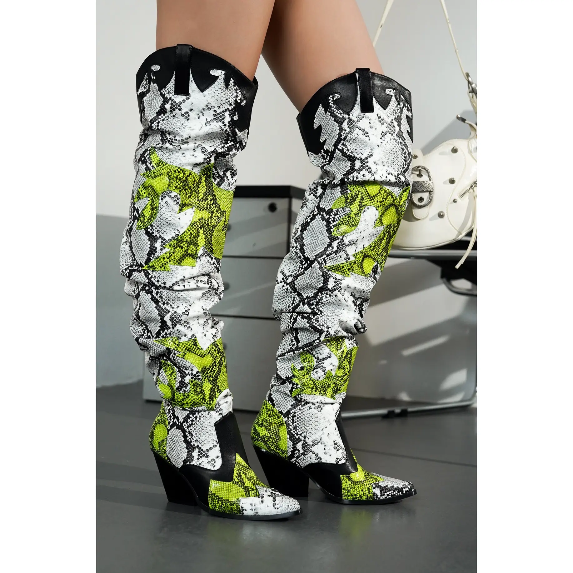 𝗦𝗵𝗼𝘄-𝗦𝘁𝗼𝗽𝗽𝗶𝗻𝗴 𝗢𝘃𝗲𝗿-𝘁𝗵𝗲-𝗞𝗻𝗲𝗲 𝗦𝘁𝘆𝗹𝗲: With a pointed toe, slouchy shaft, and angled block heel, these boots bring runway-level design to everyday wear. The tall length adds drama and edge, making them the perfect fashion-forward addition to any collection of women’s western boots.