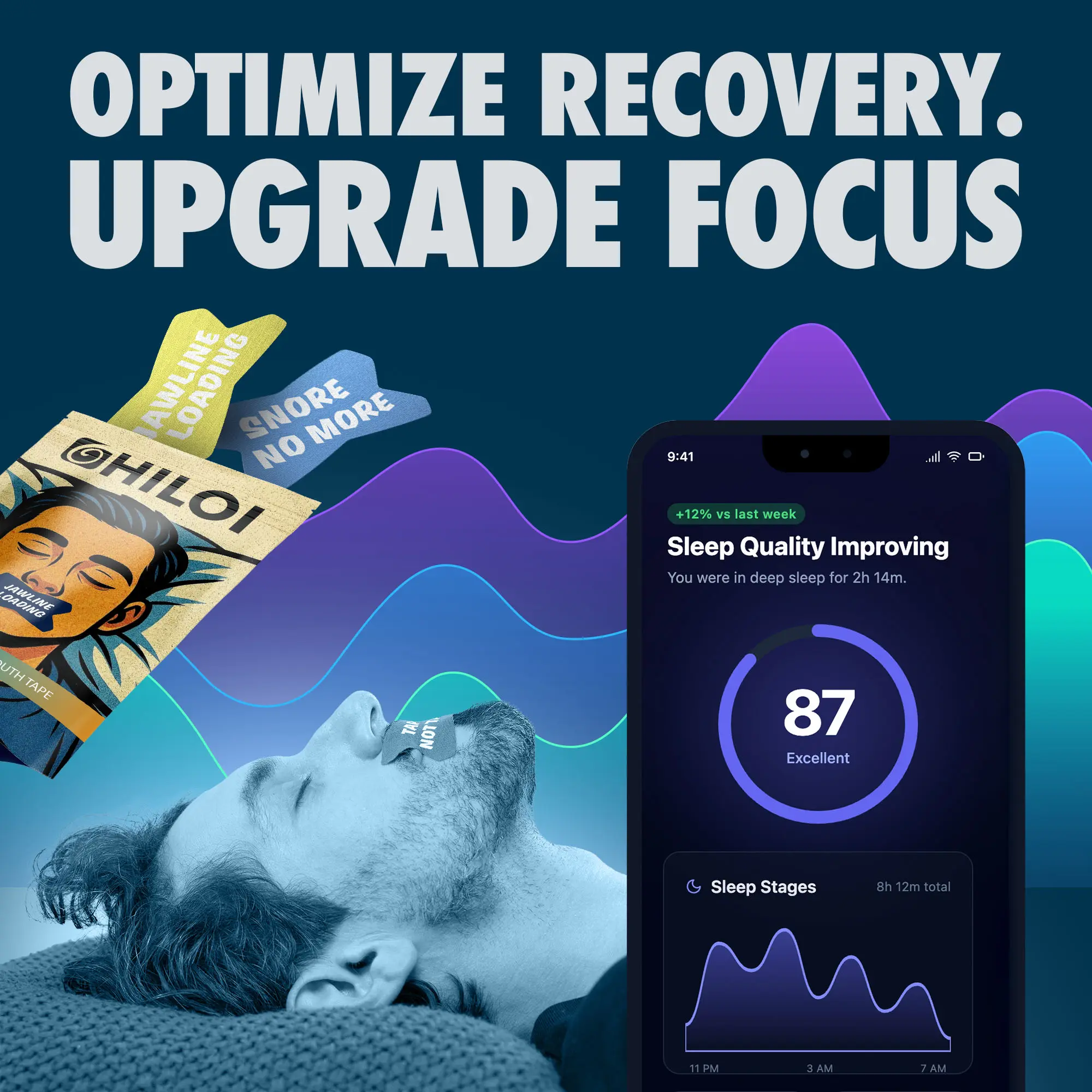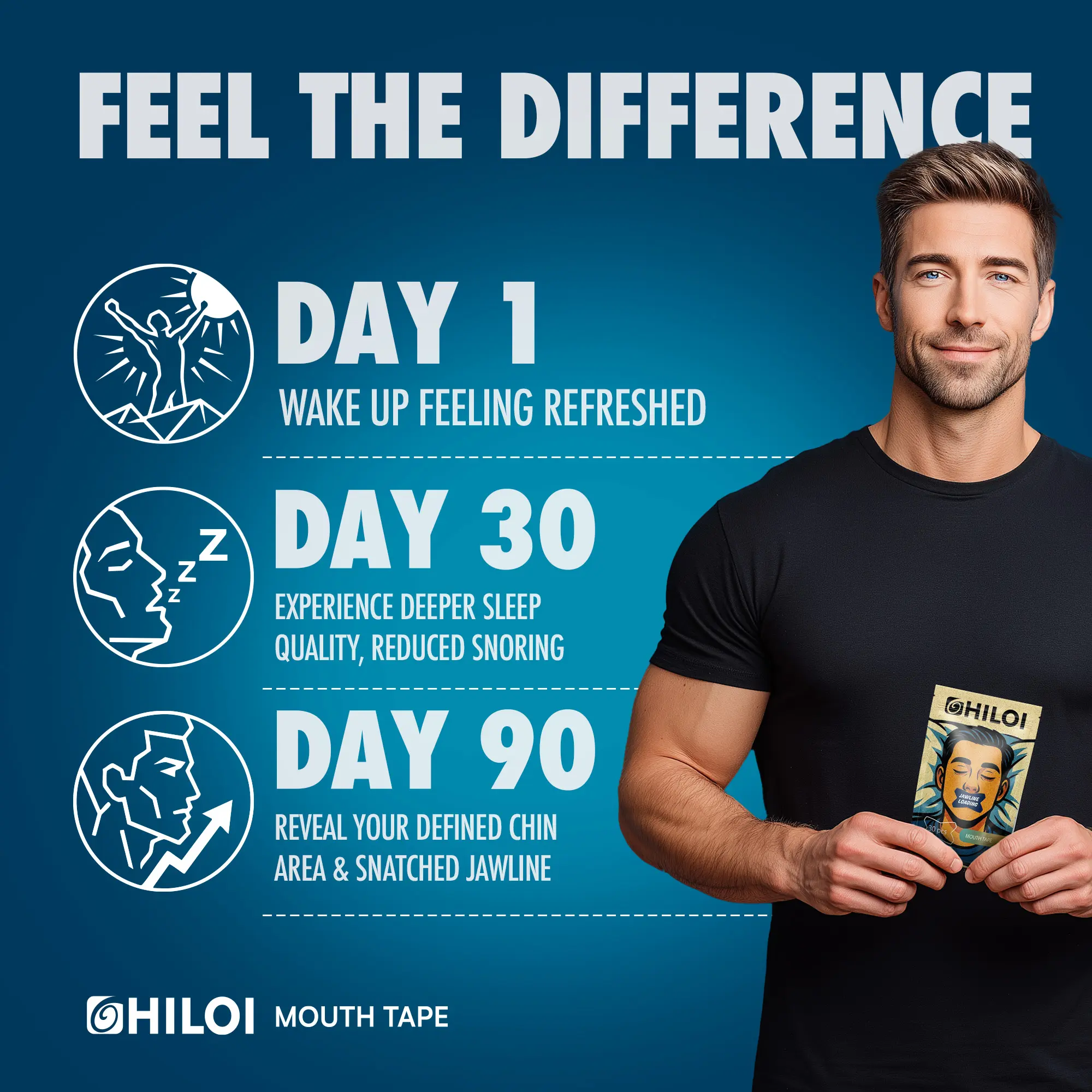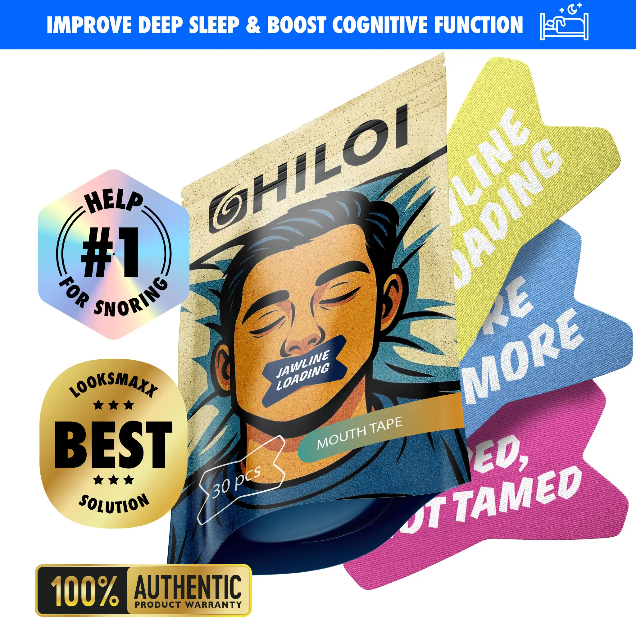 Hiloi Mouth Tape is your natural, comfortable solution to better sleep, healthier breathing, jawline support, and less snoring. Perfect for anyone looking to improve their sleep quality, enhance relaxation, reduce jaw tension, and wake up feeling refreshed.