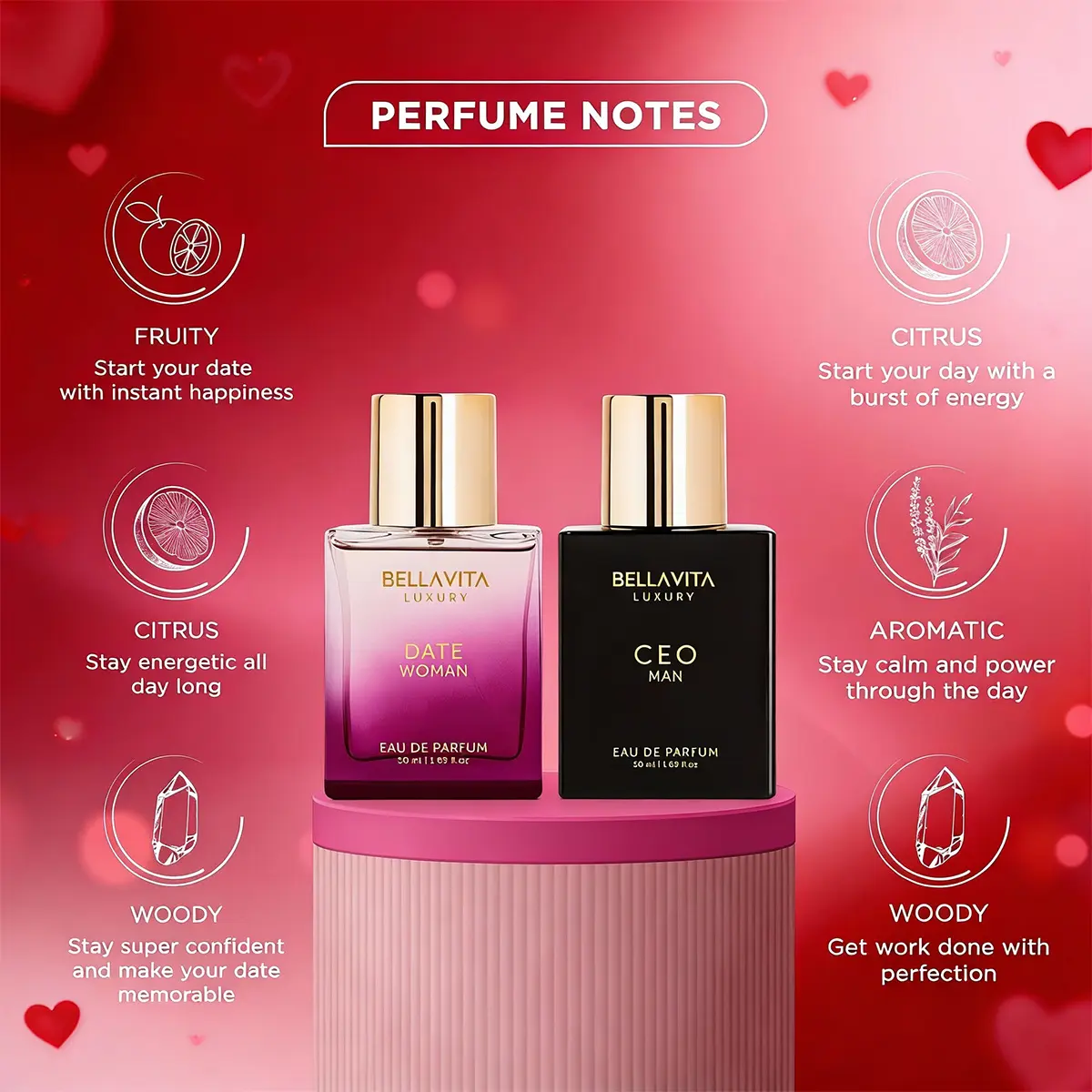 For the perfumed power players who command both boardrooms and ballrooms, BellaVita Luxury presents an unstoppable fragrance duo: Him & Her Classic Gift Set, featuring CEO Man and Date Woman. CEO Man, a bold concerto of crisp citrus and potent woods, takes command with unwavering authority. Date Woman, a romantic symphony of delicate florals and sweet fruits, adds the perfect touch of feminine allure.