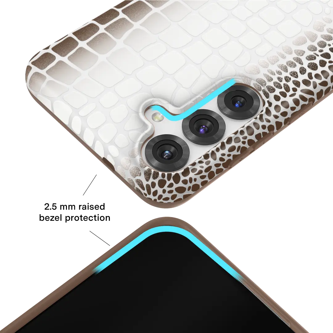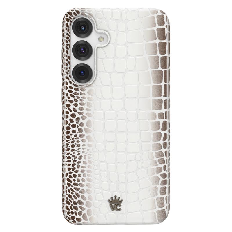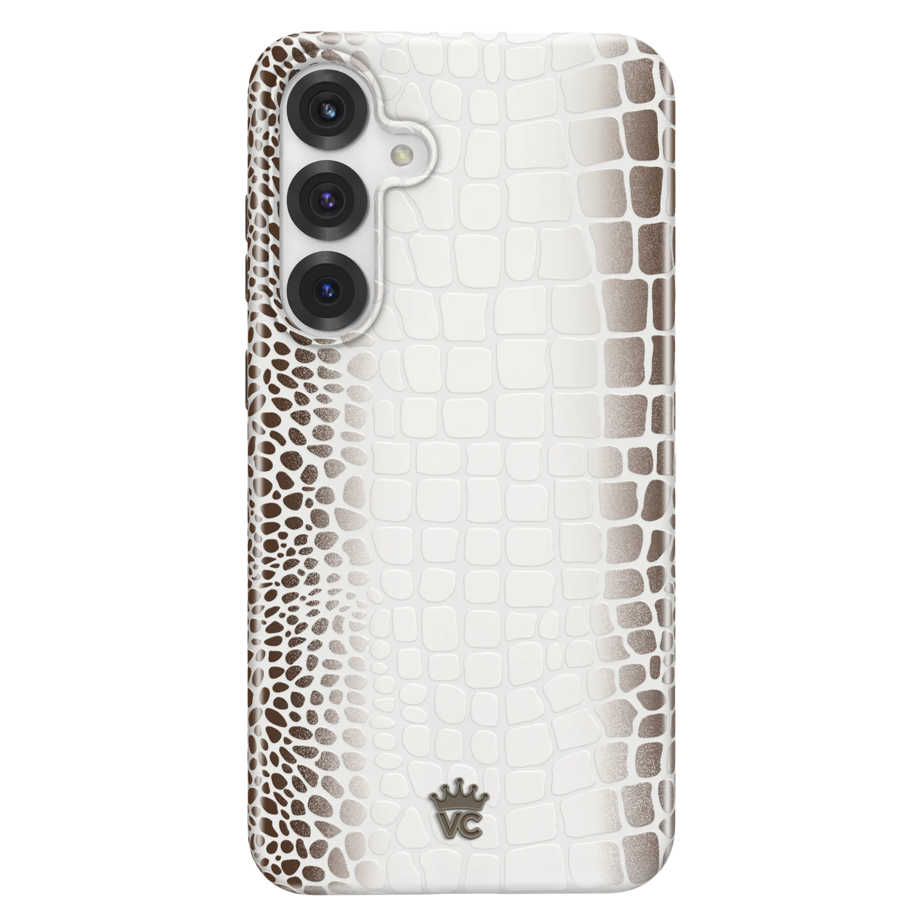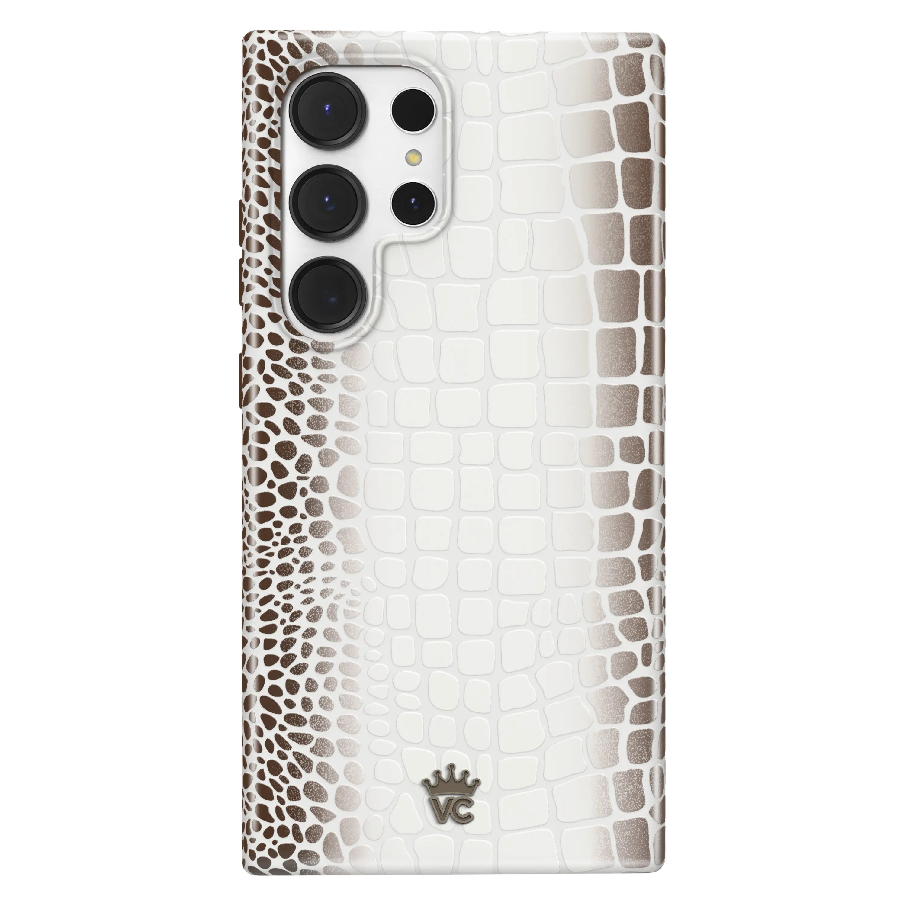 Limited Edition and Luxurious! This protective case features a glossy white to taupe ombré crocodile pattern on a monochromatic matte white base with a contrasting taupe bumper.