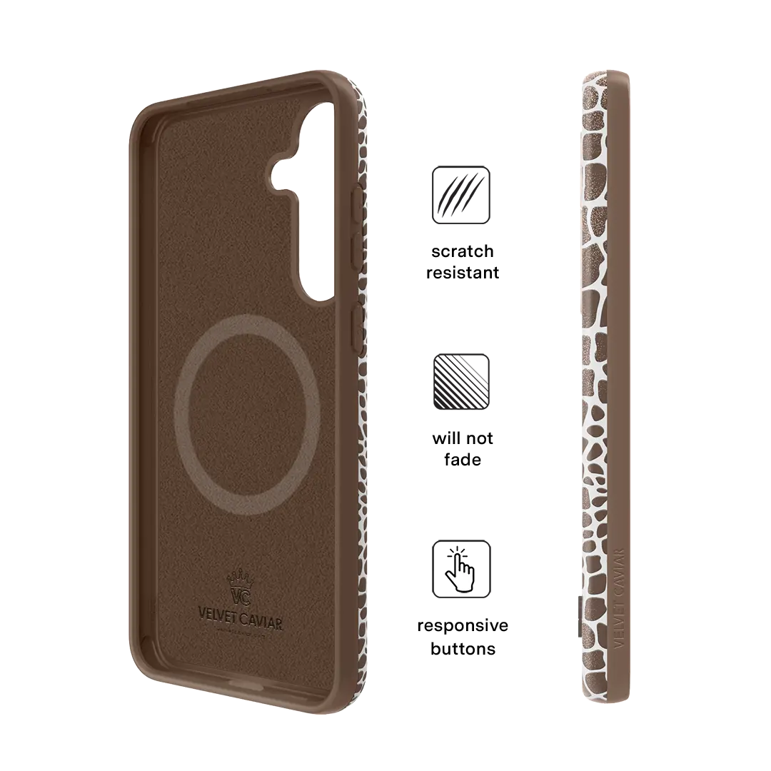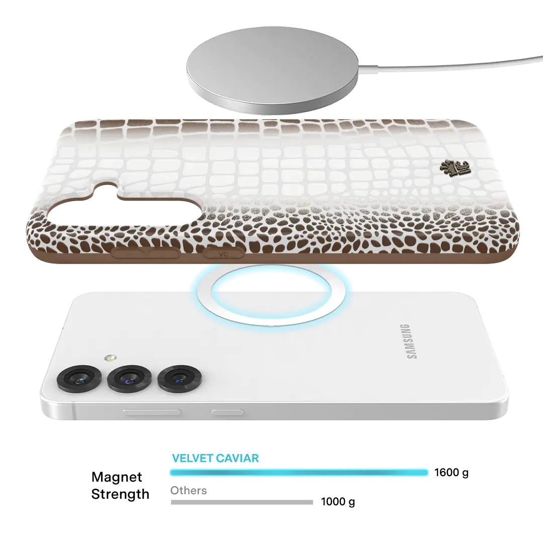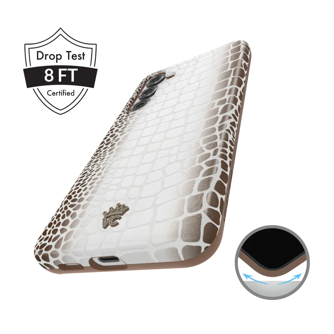 Limited Edition and Luxurious! This protective case features a glossy white to taupe ombré crocodile pattern on a monochromatic matte white base with a contrasting taupe bumper.
