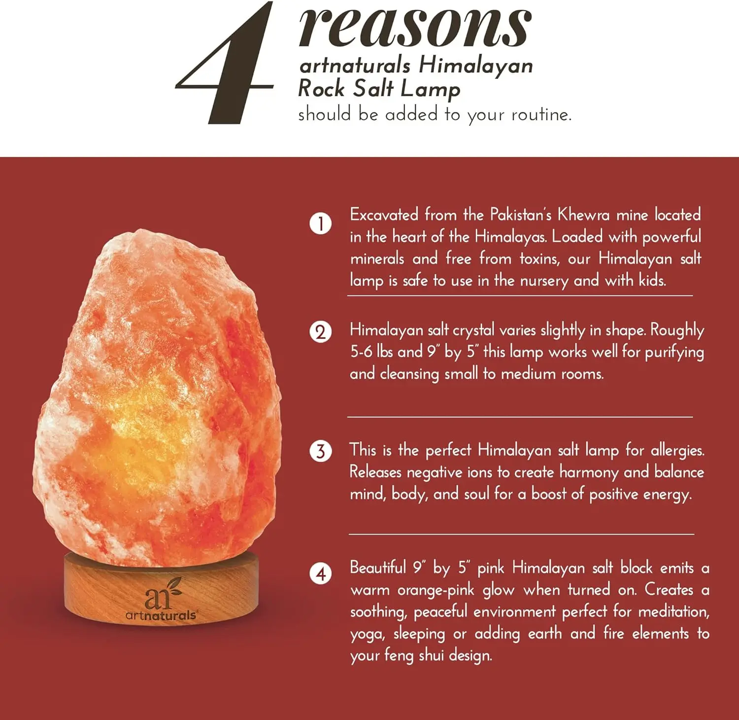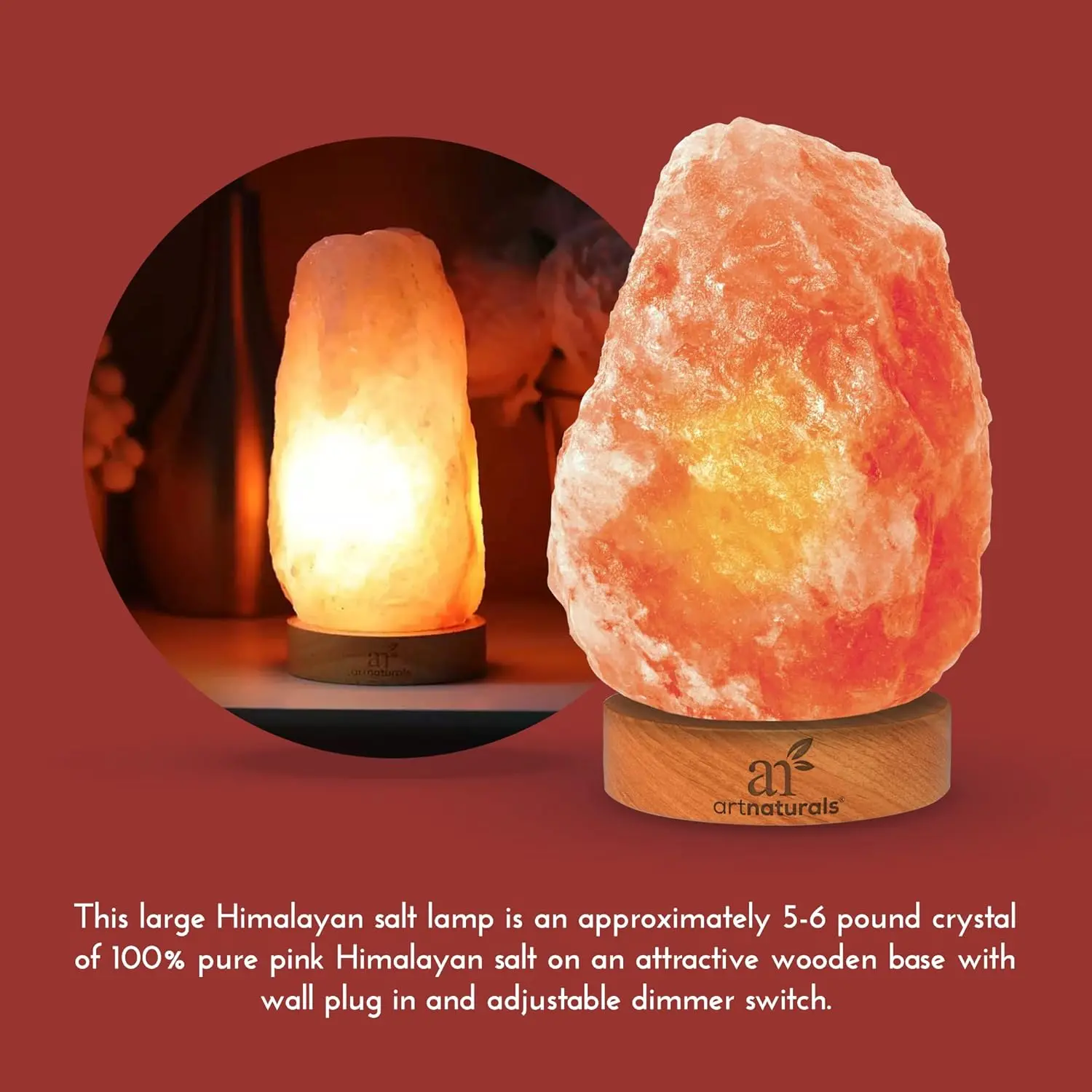 ·Natural Himalayan Salt Crystal: The pink salt crystal is hand-carved from pure Himalayan rock salt and offers a warm glow that lends a calming ambiance to any space.