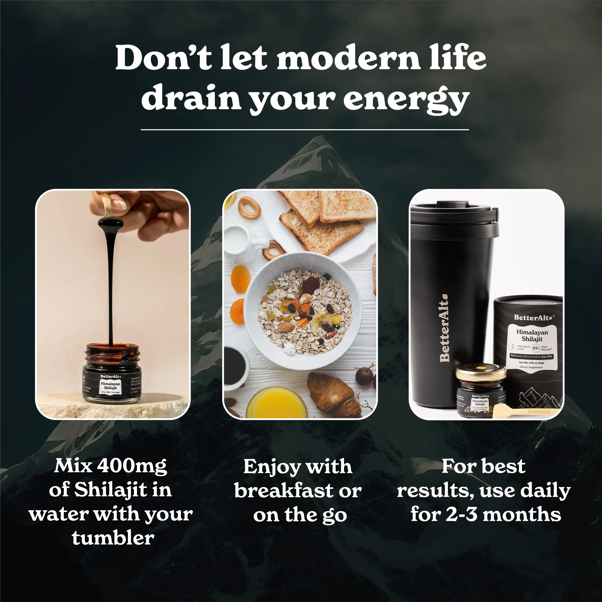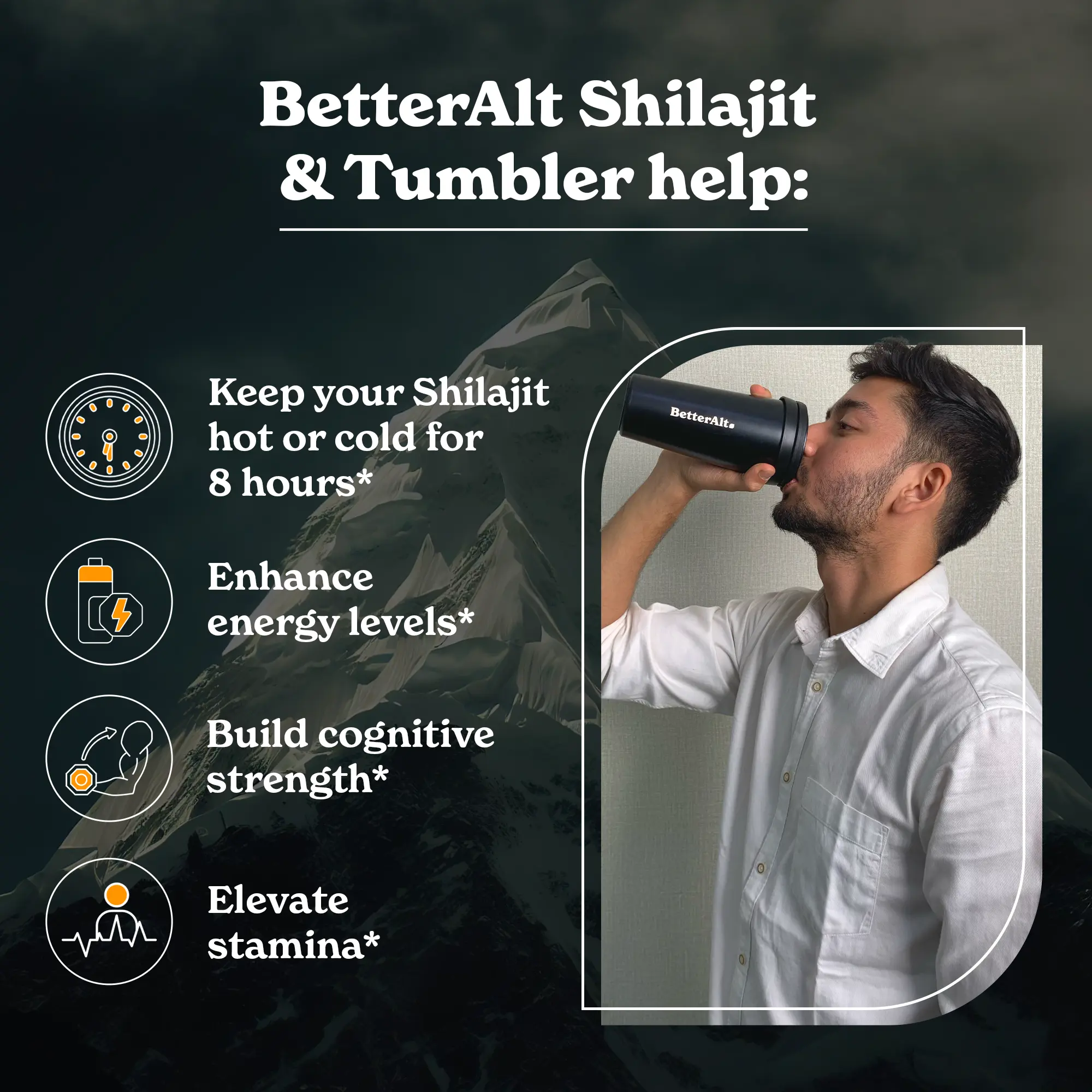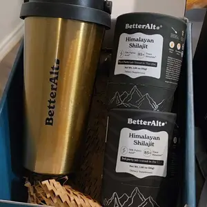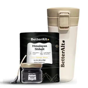 ·BetterAlt Himalayan Shilajit now comes with a convenient and insulated friend. Take your Shilajit water around with you. The bundle includes our viral Himalayan Shilajit resin, sourced from the highest altitudes of the Himalayas and a travel-friendly tumbler.