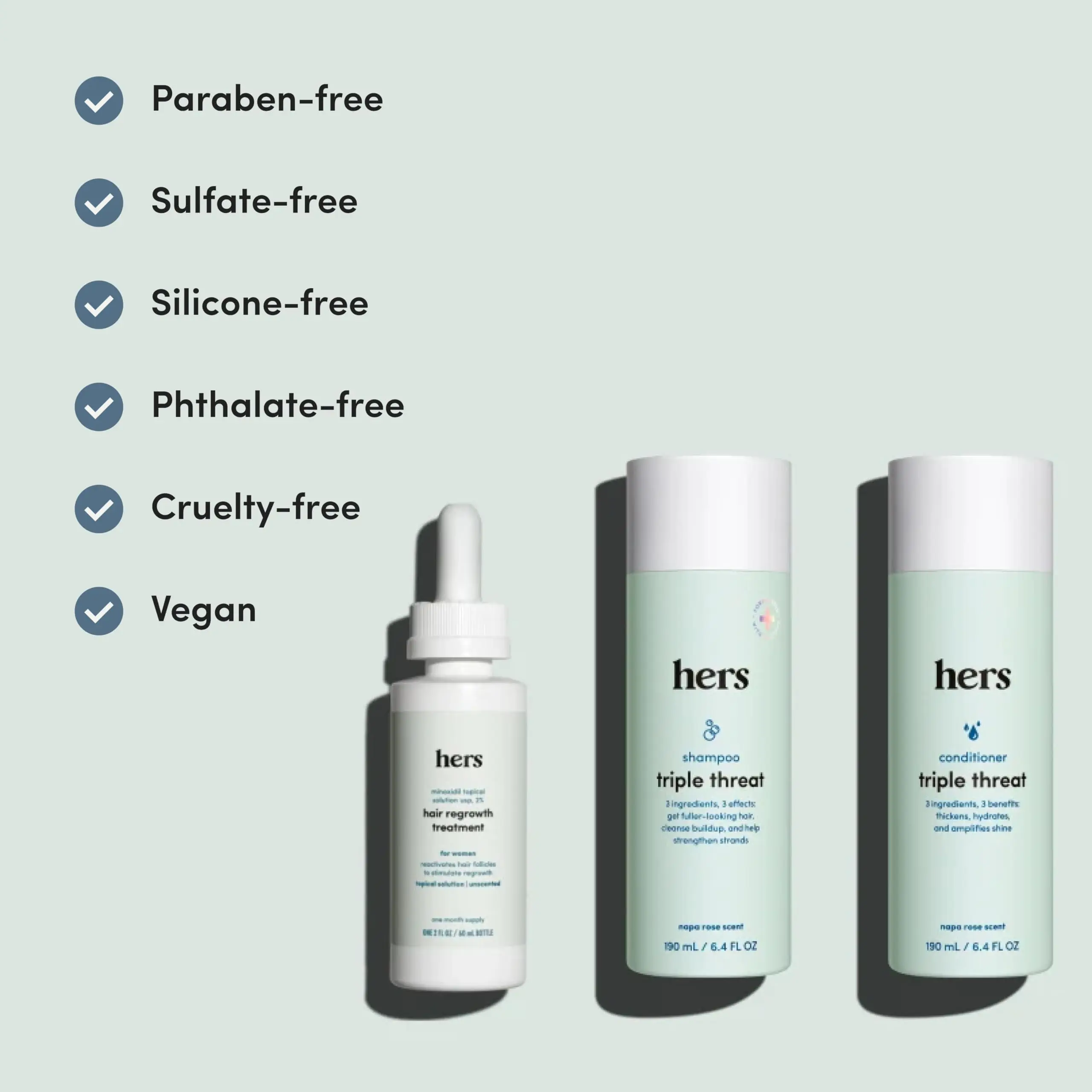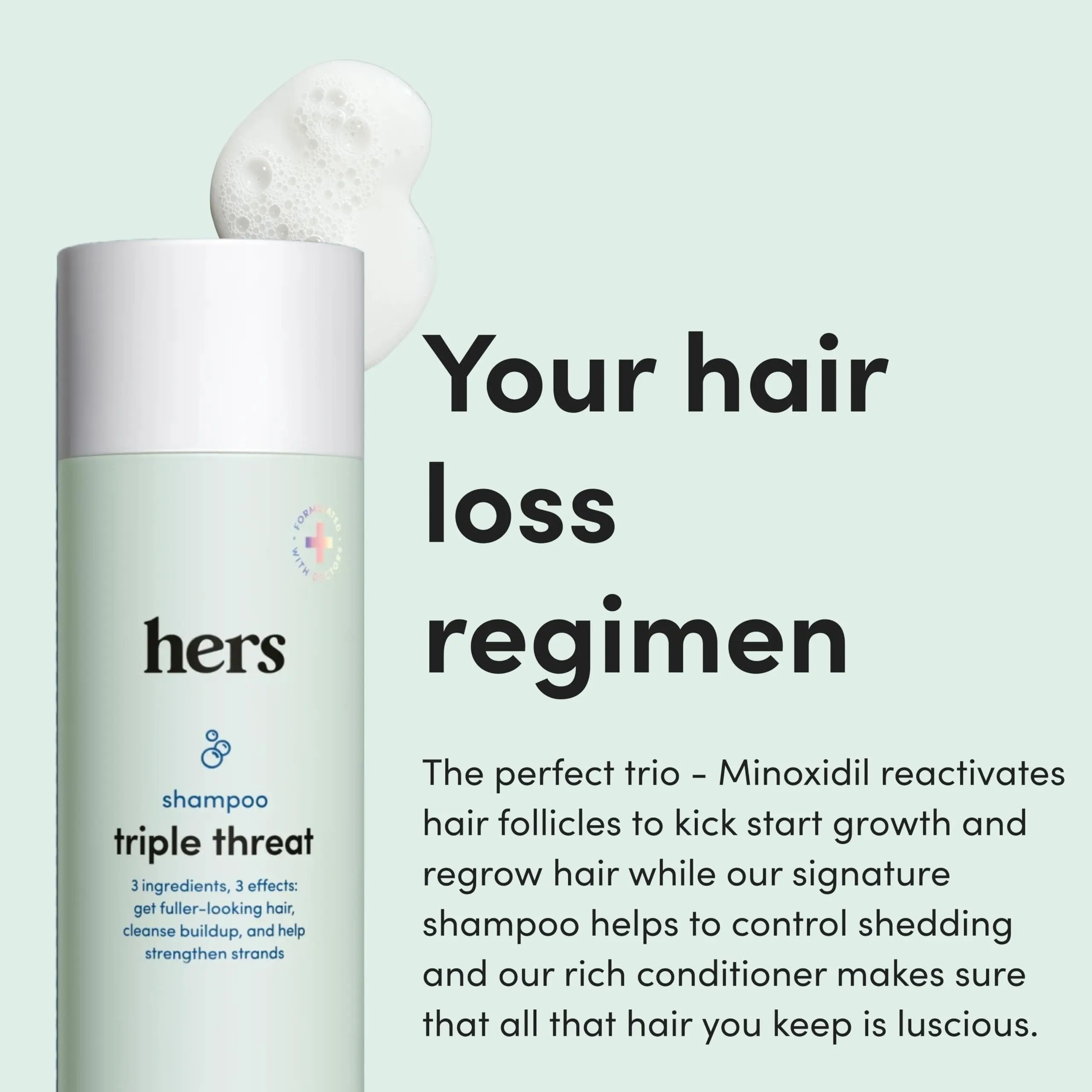·Hair Care Remedy: hers Triple Threat Shampoo, Conditioner and 2% Minoxidil Set includes strengthening shampoo, moisturizing conditioner, and 2% minoxidil treatment for hair care and regrowth support