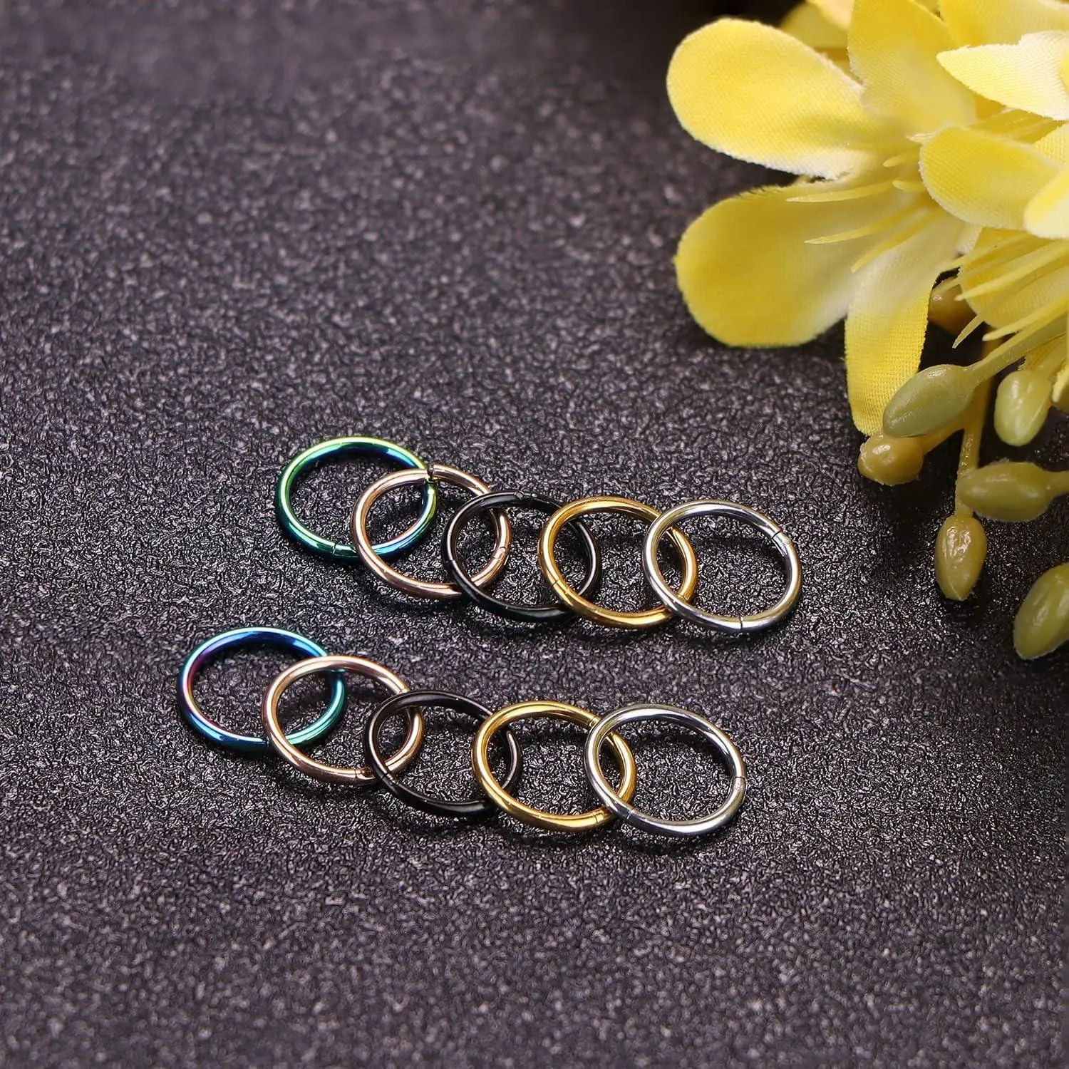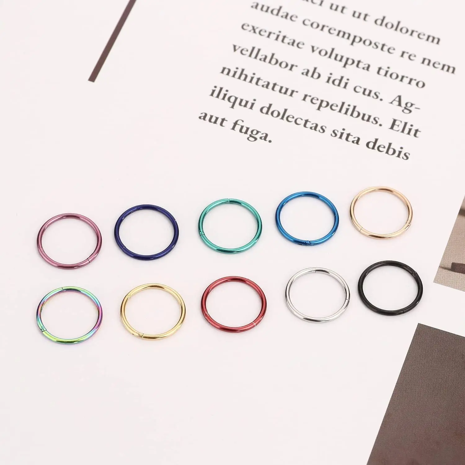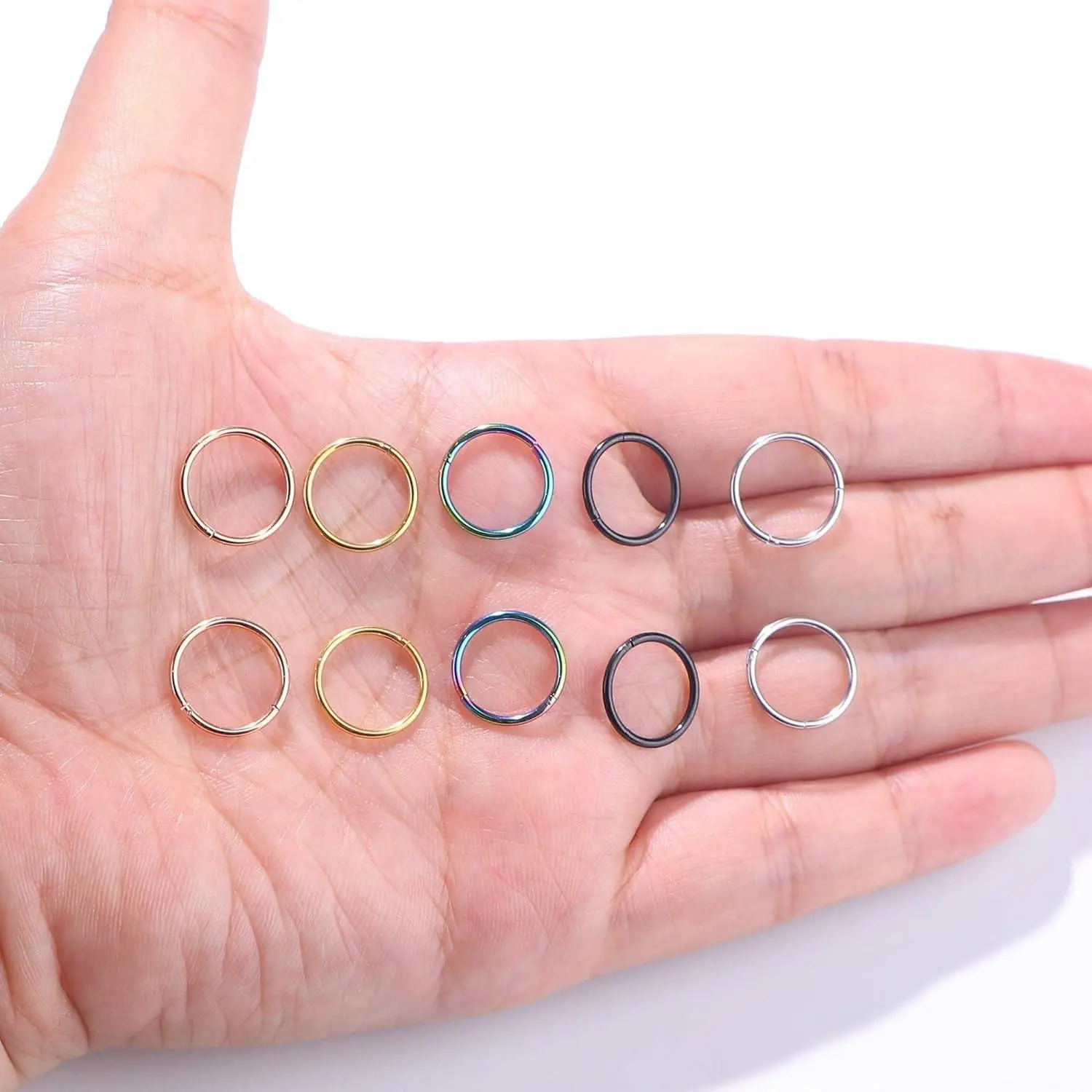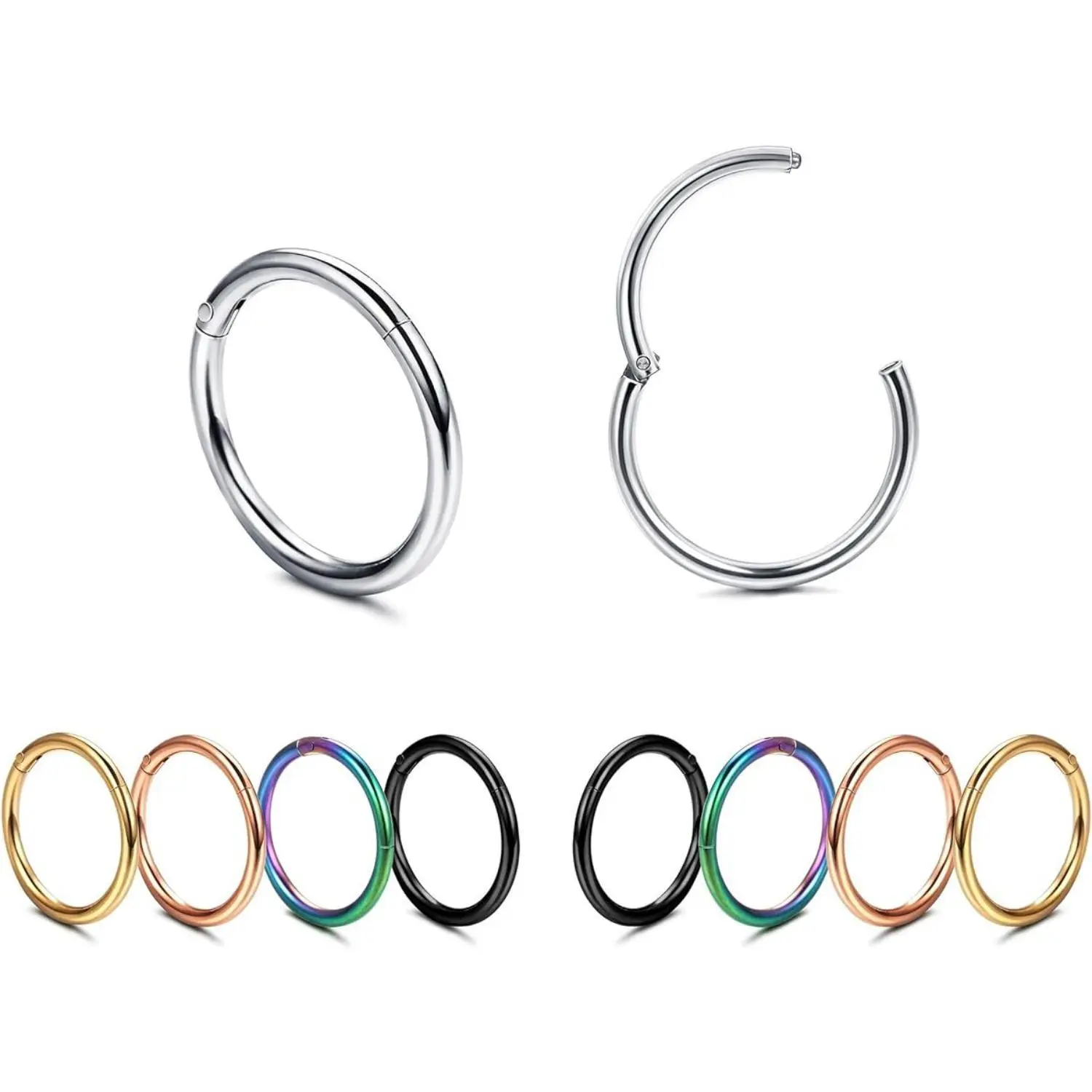 Perfect Size: One set includes 10 stainless steel septume rings. Gauge size is 1mm=18G. Three kinds of inner daiameter sizes are available. 8mm (0.31''), 10mm(0.39''), 12mm(0.47''). All of them are perfect sizes for nose or ear piercing. You caould choose the perfect size according to your own needs.