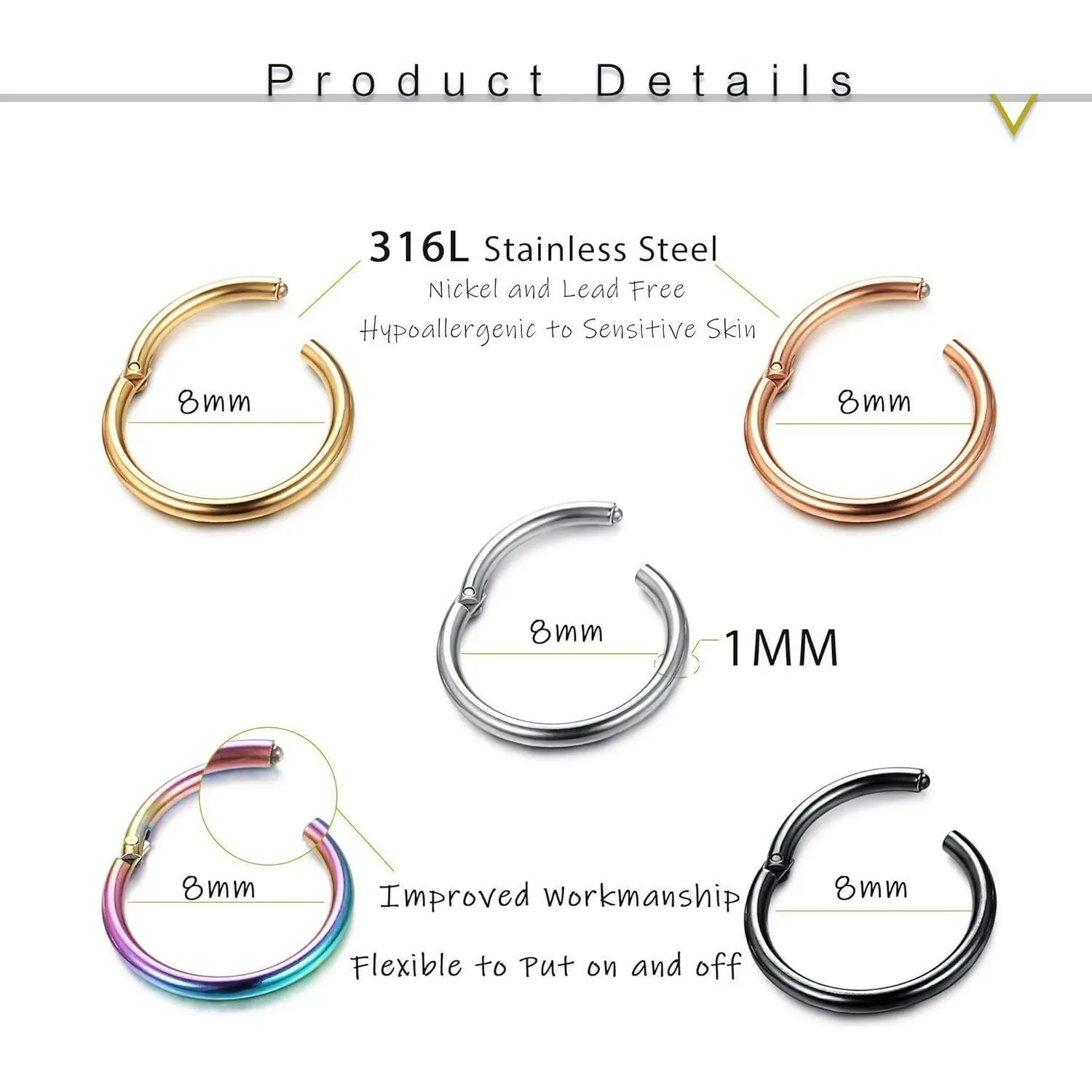 Safety Material: The stainless steel hoop earrings are made of 316L surgiacal stainless steel, nickel and lead free, friendly to sensitive skin. The high quality stainless steel makes these seamless lip nose rings are not easy to rust or break down.