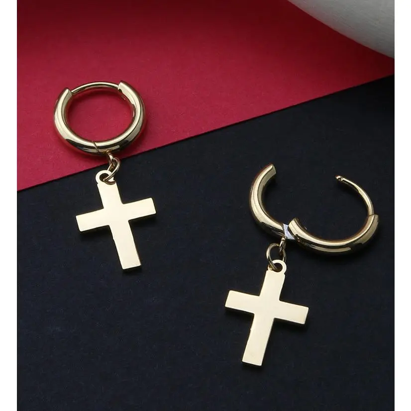Hoop-style earrings with a dangling cross attached. Made from gold pvd on 316 stainless steel. Size is 18G. Length is 5/16" (8mm). The hinged design is easy to open and close. Sold in pairs (2 pieces). For healed lobes/piercings.