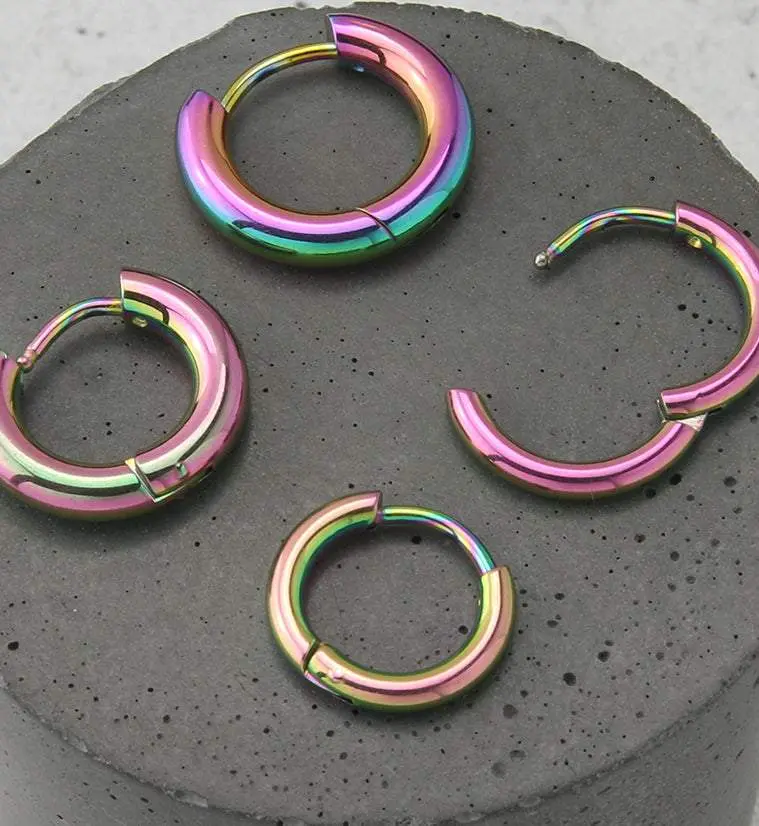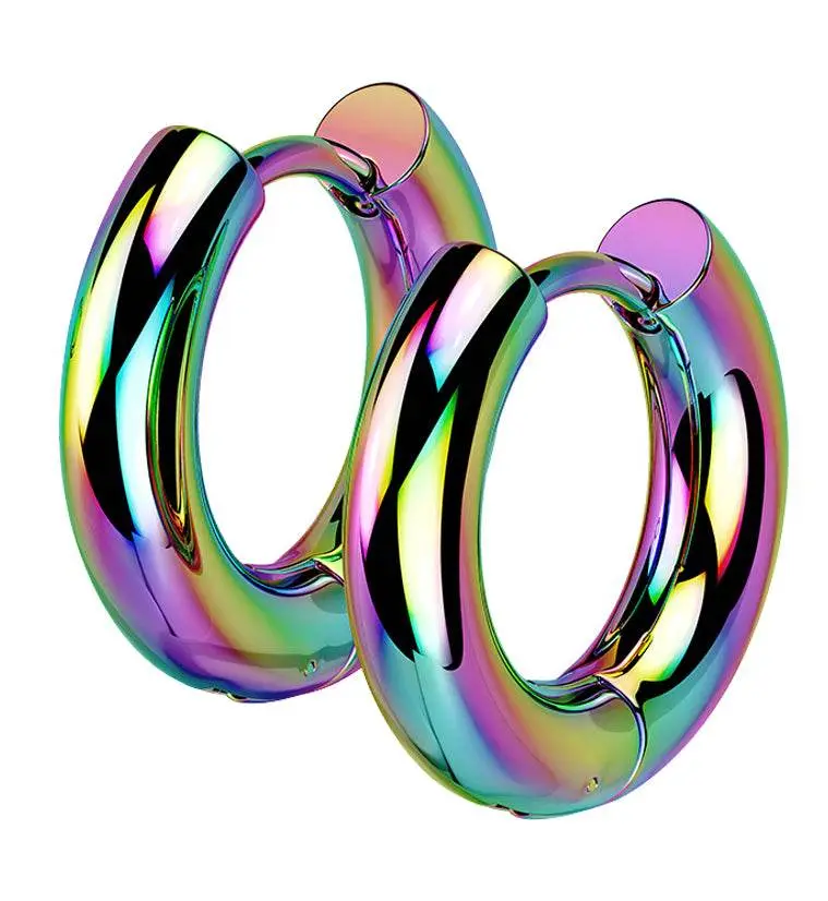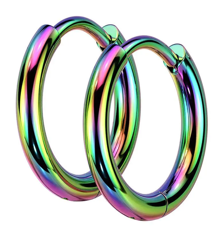 Hoop-style earrings with a hinged design. Made from rainbow pvd on 316 stainless steel. Size is 18G. Pick your diameter size and side thickness from the menu. The hinged design is easy to open and close. Sold in pairs (2 pieces).