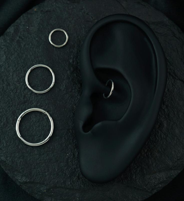 This Titanium Hinged Segment Hoop Ring is the perfect addition to any piercing. It gives both a classy and sleek look with its natural silver coloring. This ring takes the fight out of trying to insert a ring and keep it in place. This seamless piece features a hinged opening that locks into place with a small click. It is a simplistic and elegant way to showcase your piercing. This piece is sold individually in a 20G - 00G and in variety of diameters to fit your piercing comfortably. Titanium is a great option for anyone with sensitivities!