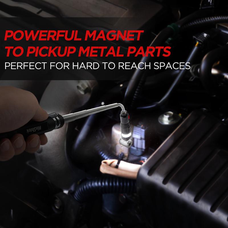 The tool extends from 6.6 inches to 22 inches and features a strong magnetic head and base, allowing it to pick up metal parts such as screws or nails in hard-to-reach places. The magnetic base can attach to metal surfaces to free your hands while working — perfect for holiday DIY projects.