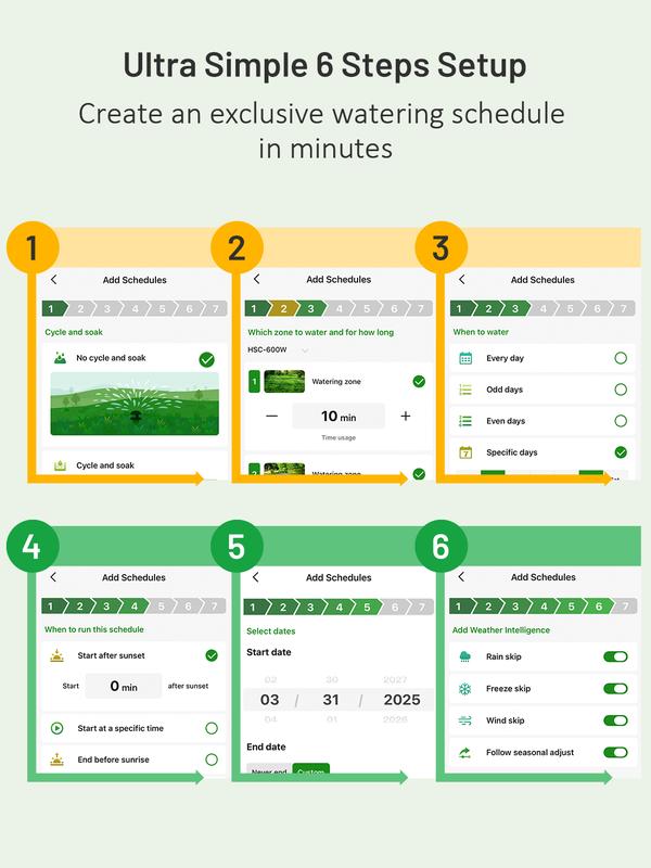 Smart Weather Skips: It makes automatic irrigation more humanized, with features such as smart rain skip, freeze skip, and wind skip. In the event of unfavorable climatic conditions, such as rain, frost, or wind, the preset irrigation tasks are automatically skipped. This avoids the burden of over-irrigation on the plants, reduces water wastage, and helps to maintain suitable soil moisture conditions.